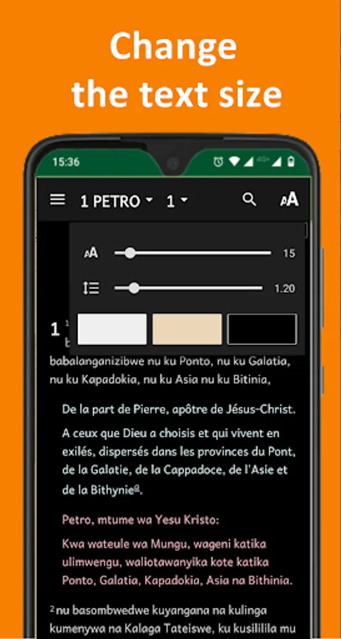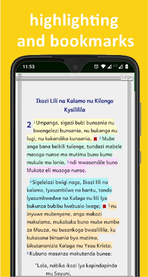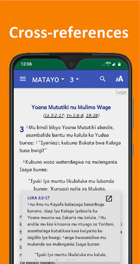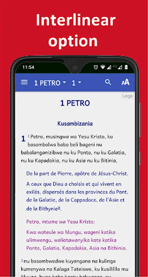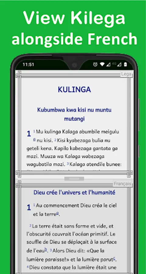 "Kilega Biblia" is an app for reading and studying the Bible in the Kilega language ( also known as Lega-Shabunda, Igonzabale, Ileka-Igonzabale, Kirega, Lega, Lega-Malinga, Leka-Igonzabale, Rega) spoken in the Democratic Republic of Congo. The French Bible "Français courant 97' and Swahili Bible "Toleo Wazi Neno" are also included in the application.