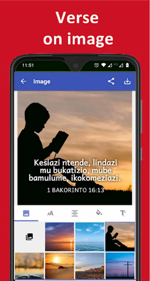 • Use the "Verse on Image Editor" to create beautiful images to share with your family and friends via email, Facebook, WhatsApp or other social media.