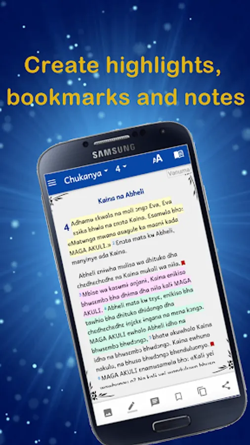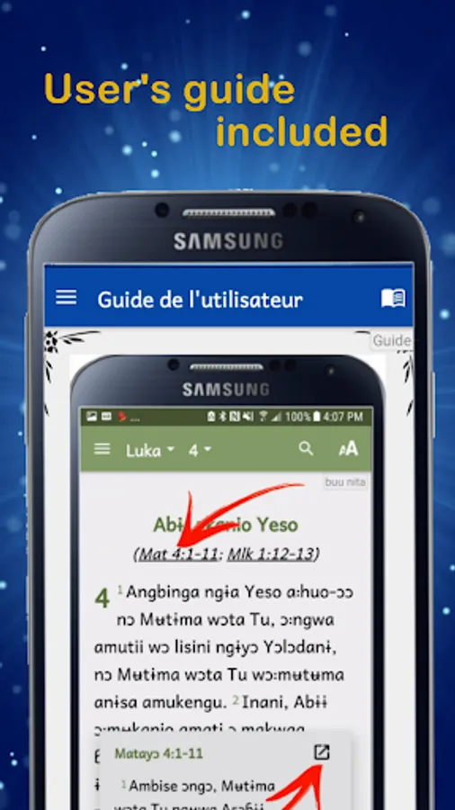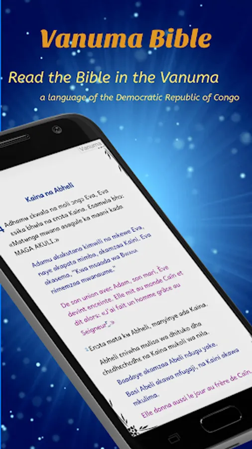 "Vanuma Bible" is an app for reading and studying the Bible in the Vanuma language (also known as Bambutuku, Bvanuma, Livanuma, Nyali-Tchabi, South Nyali) spoken in the Democratic Republic of Congo. The Bible is in process of being translated into Vanuma. More Bible books in Vanuma will be added to this app as they become available. The French Bible "Français courant 97' and Swahili Bible "Toleo Wazi Neno" are also included in the application.