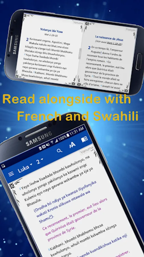 • View Vanuma text alongside French and/or Kiswahili translation.