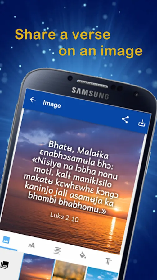 • Use the "Verse on Image Editor" to create beautiful images to share with your family and friends via email, Facebook, WhatsApp or other social media.