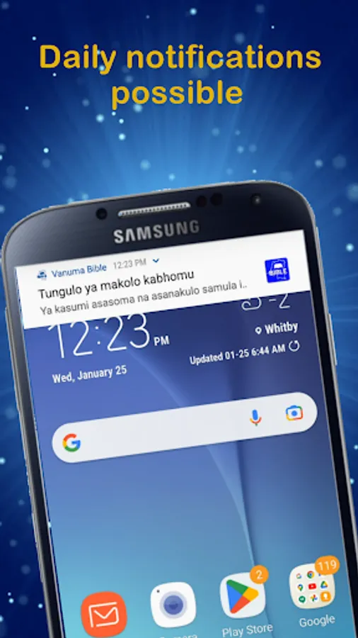 • Notifcations (can be changed or disabled) - "Verse of the day" and "Daily Bible Reading Reminder".