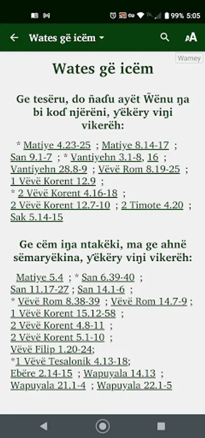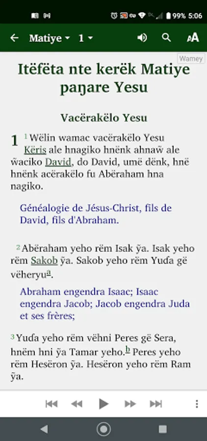 Read and listen to Genesis and the New Testament of the Bible in the Konyagi/Wamey language.