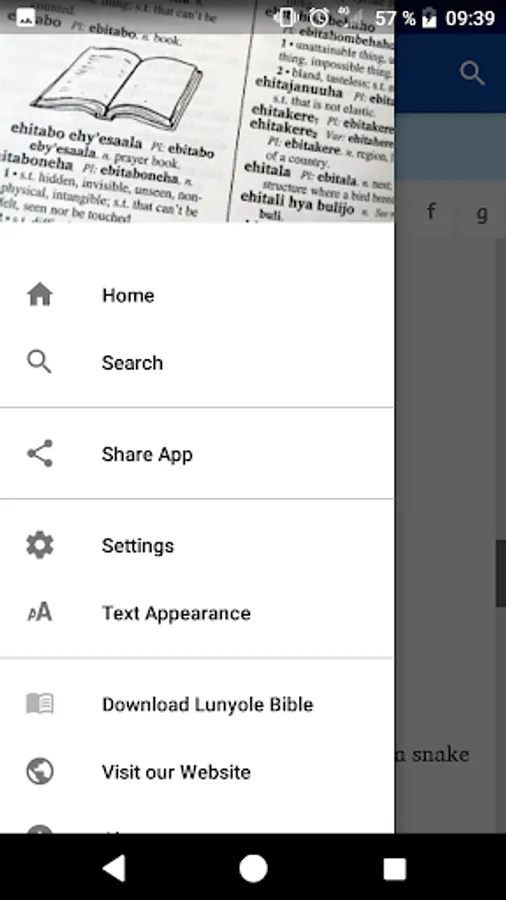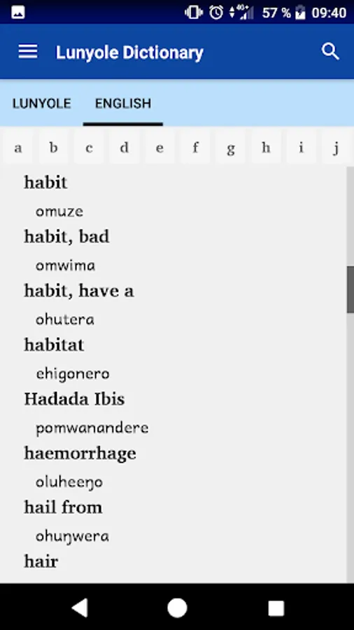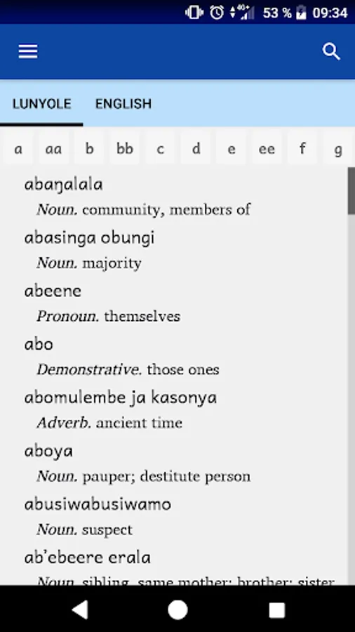 This dictionary will help those who speak Lunyole and those who want to learn to speak Lunyole since it contains the everyday language in use by the Banyole people. The words in this dictionary are natural Lunyole language and they are written in the standard spelling (orthography) of Lunyole. It is a blessing to learn to read and write based on the standards set out in this book. It is our hope that this book and what it contains will be like a source of water that does not dry up during the drought. With this dictionary, we hope to develop every Munyole into people who can be proud of our language.