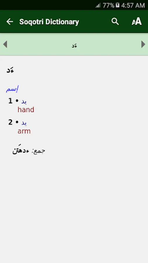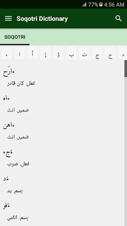 This application is a free application. It is a small dictionary that contains almost more than 530 Socotra words with their meanings in Arabic and English. The entries are written in a new linear graphic similar to Arabic but with some special characters to deal with sounds that do not appear in Arabic. Also, the spelling rules of the words do not follow the spelling rules of the Arabic language. At the moment the words are sorted in Socotra but in the future it will be possible to search for words in Arabic and English. The menus are set for order tracking on your phone.