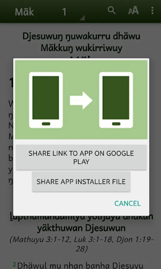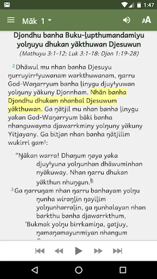 Now listen and read the Dhuwa-Dhaŋu'mi Mäk. The text is highlighted while the audio is played so the reader can follow along. The audio will play even when you are not connected to the Internet.