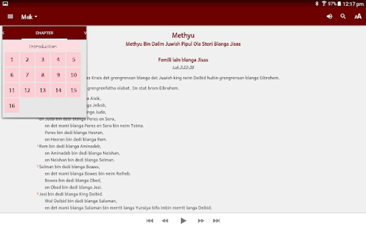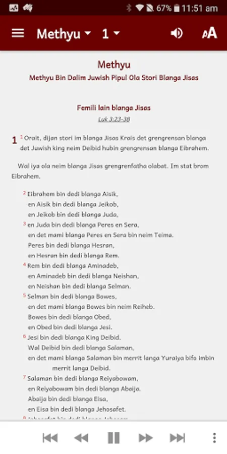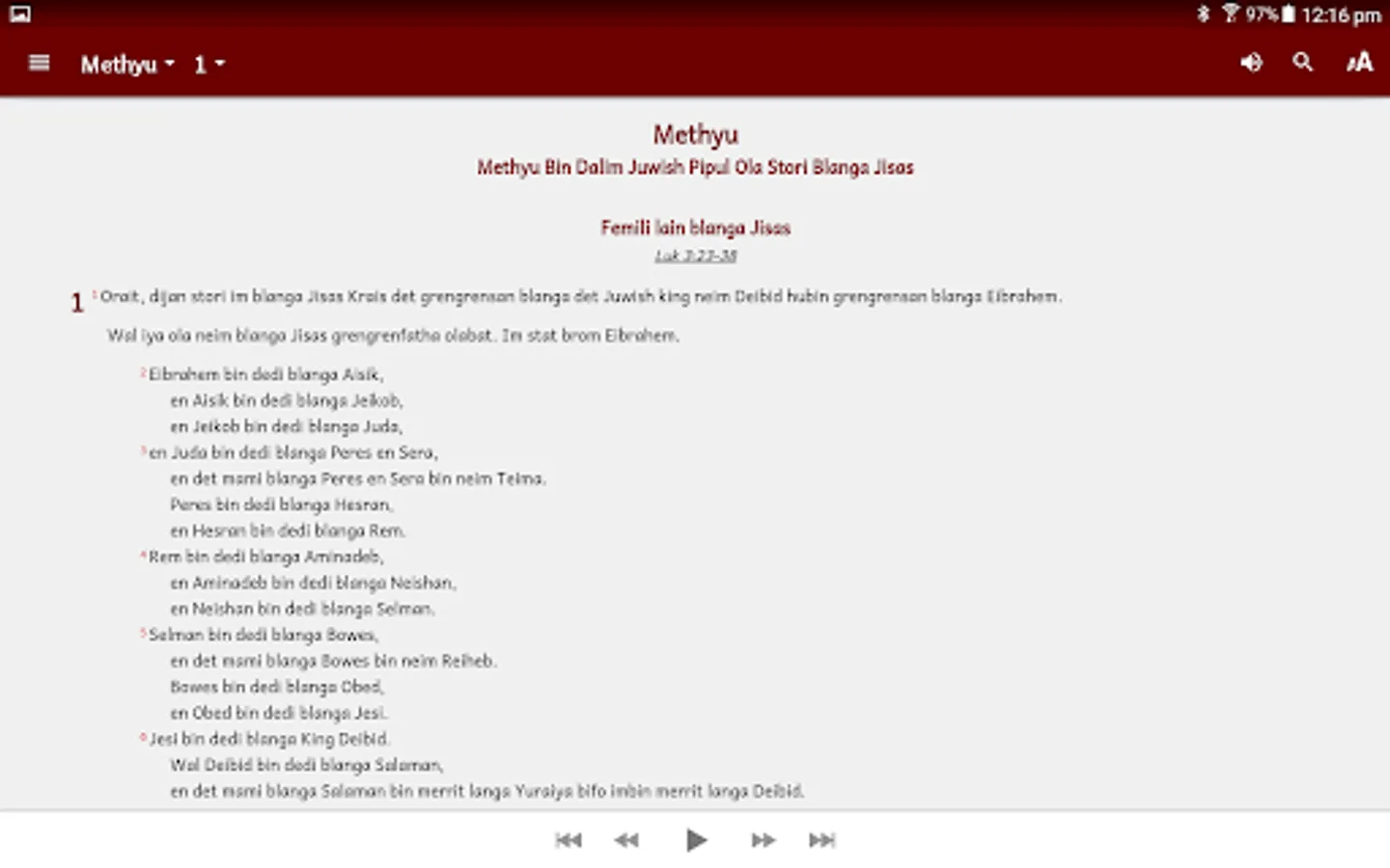 The Kriol Baibul contains the complete Old and New Testament books in the Kriol language of Australia. Audio for New Testament and a few Old Testament books are available for streaming or download.
