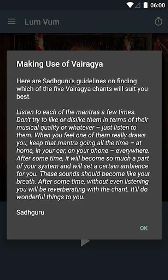 Listen to each of the mantras a few times. Don't try to like or dislike them in terms of their musical quality or whatever – just listen to them. When you feel one of them really draws you, keep that mantra going all the time – at home, in your car, on your phone – everywhere. After some time, it will become so much a part of your system and will set a certain ambience for you.
