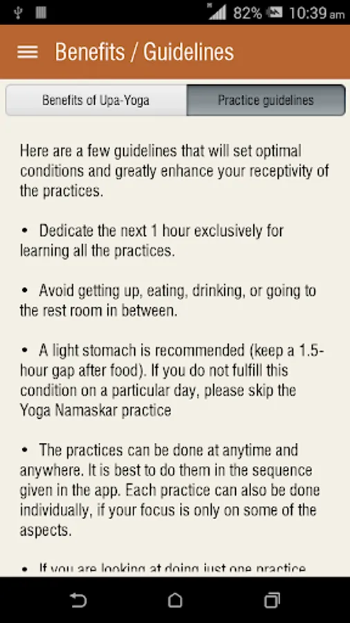• The practices can be done at any time and anywhere. It is best to do them in the sequence given in the app. Each practice can also be done individually, if your focus is only on some of the aspects.