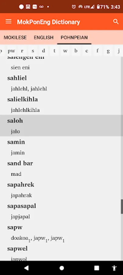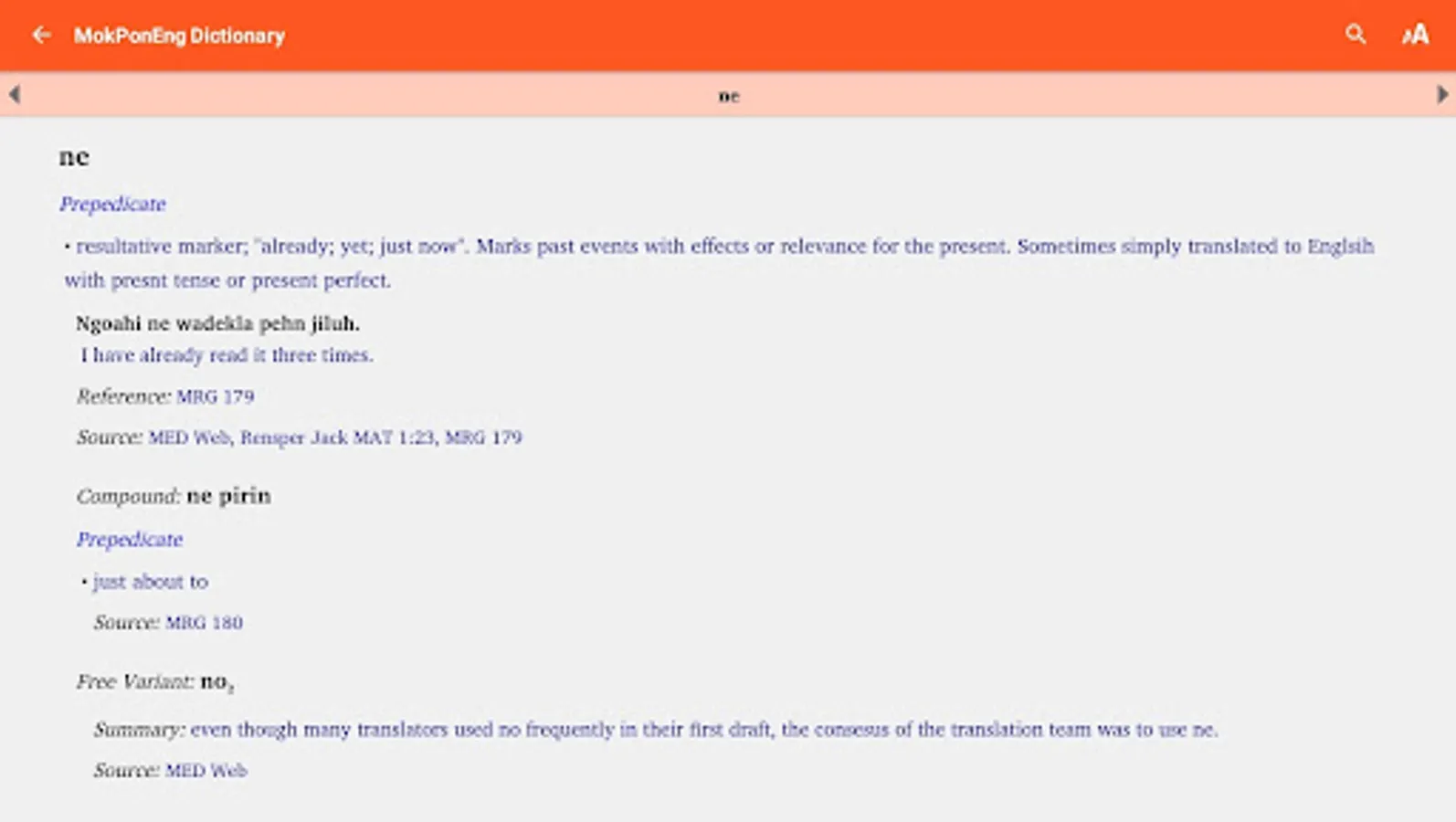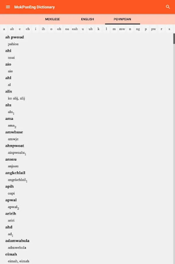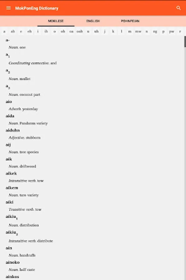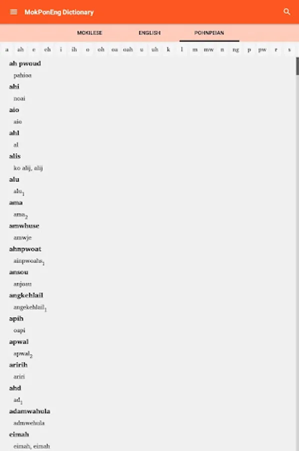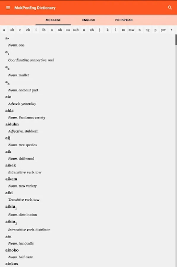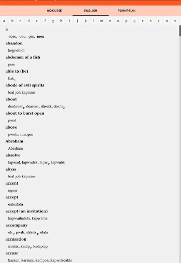 This Mwoakilloa - English - Pohnpeian dictionary is a by-product of the ongoing Bible translation project. It will be updated as the data grow in completeness and accuracy.