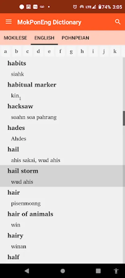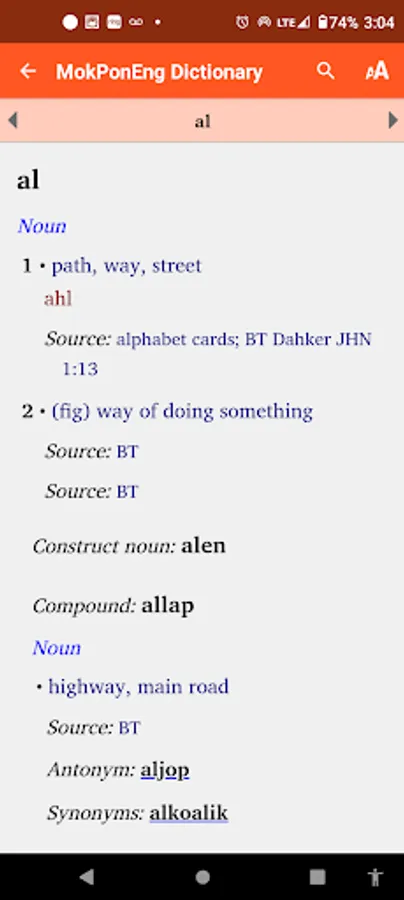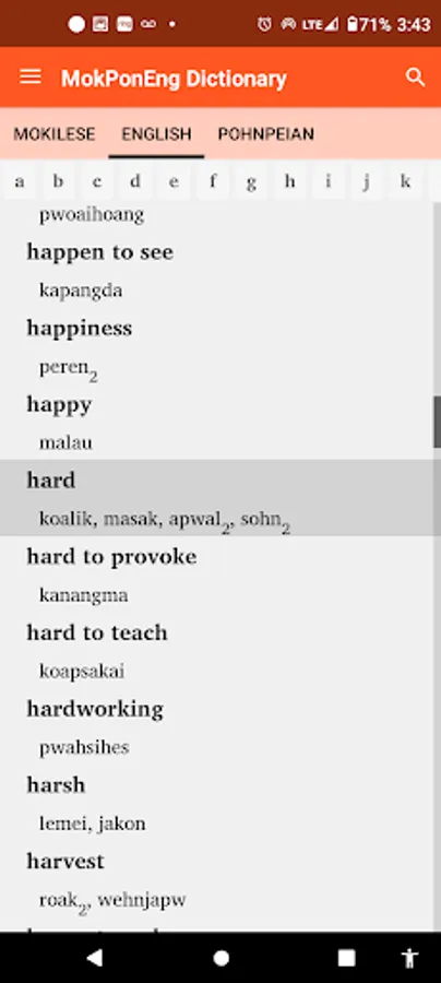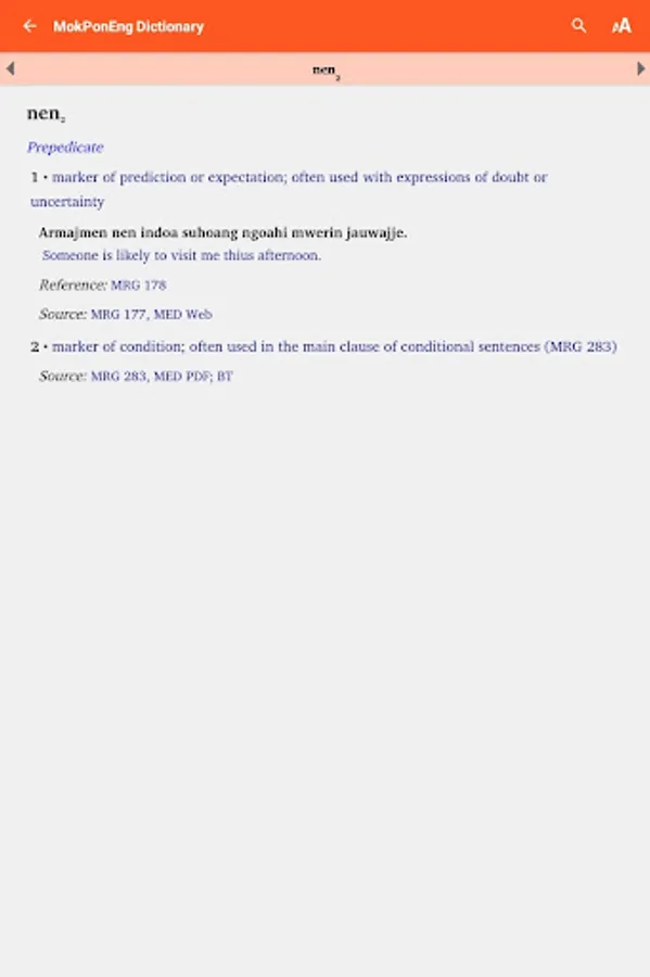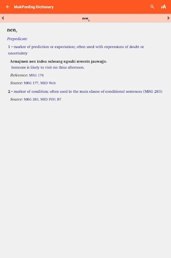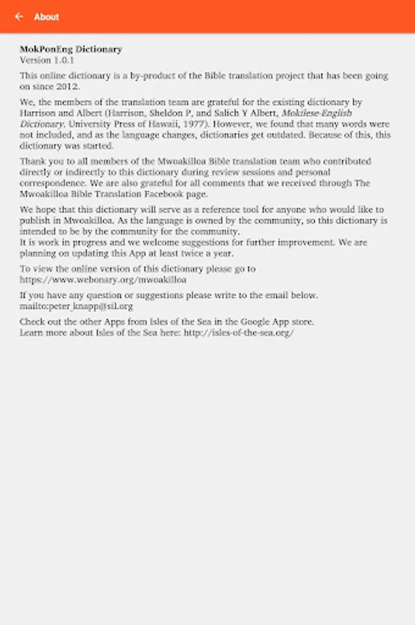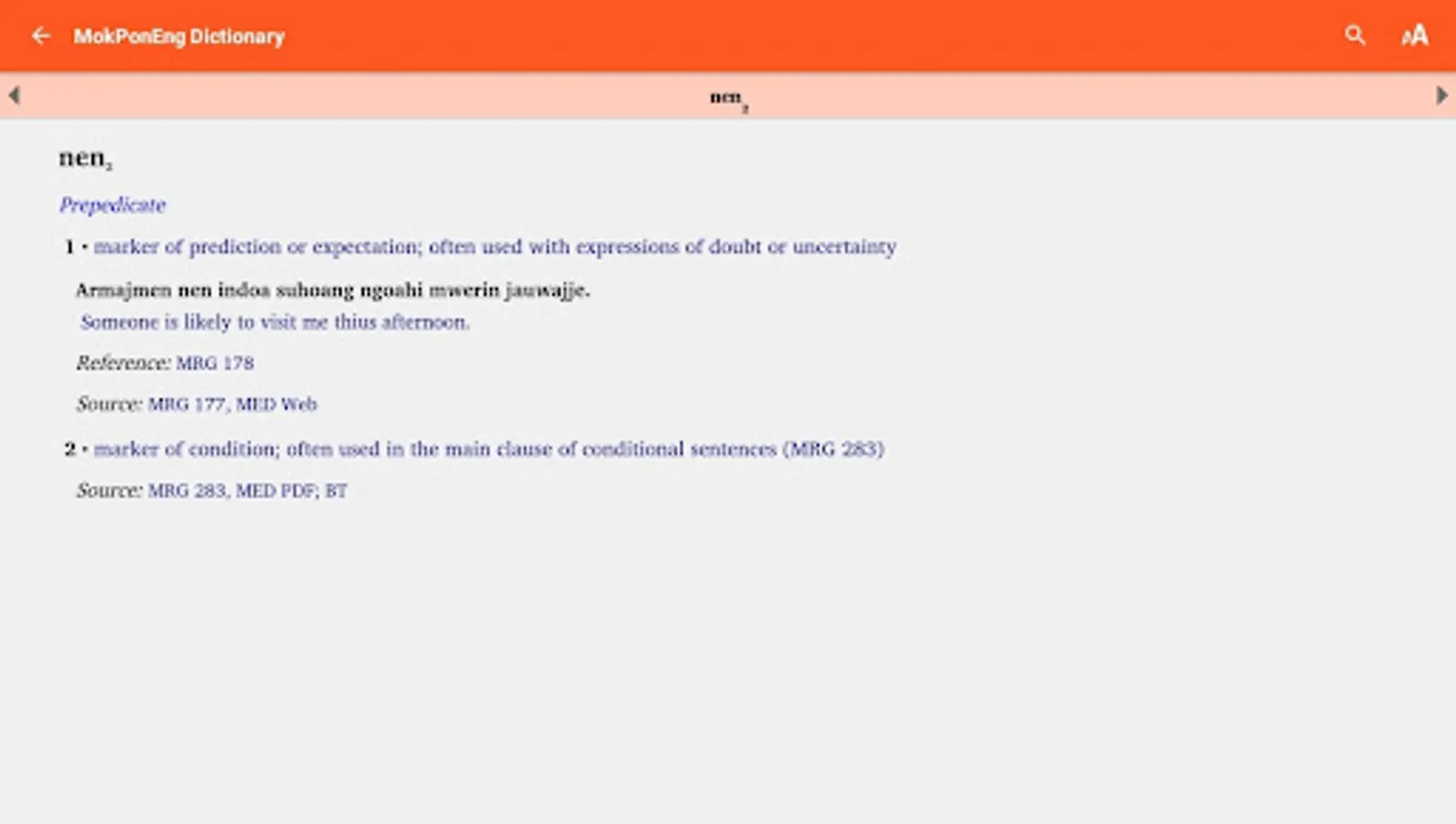 This Mwoakilloa - English - Pohnpeian dictionary is a by-product of the ongoing Bible translation project. It will be updated as the data grow in completeness and accuracy.