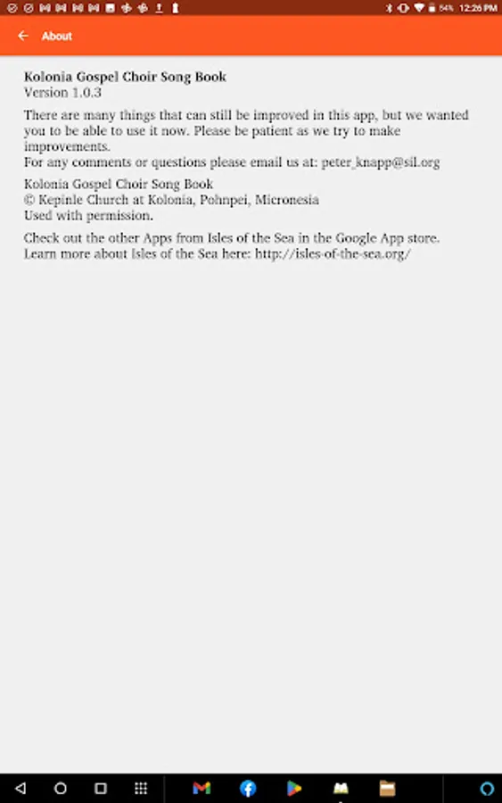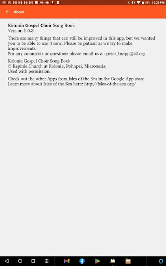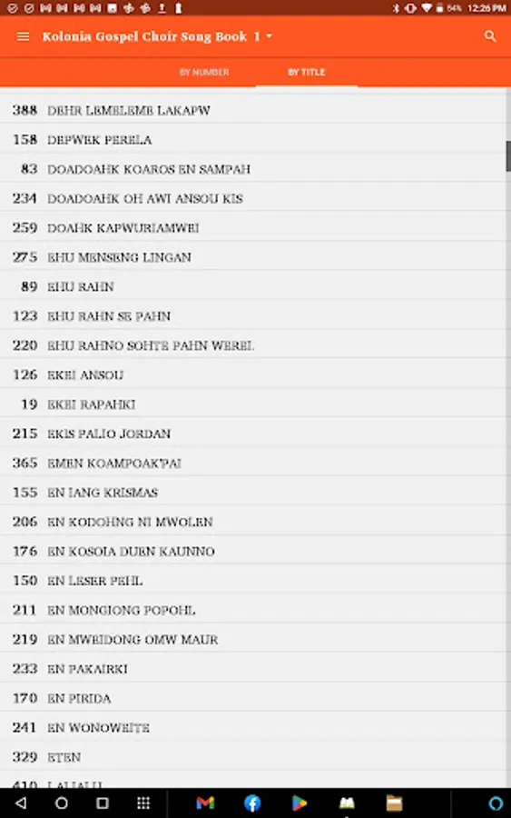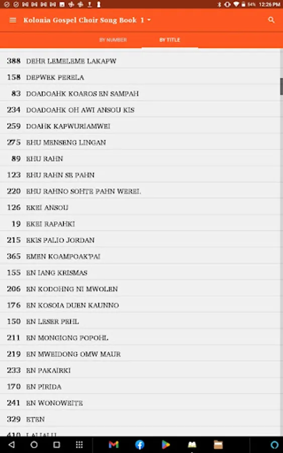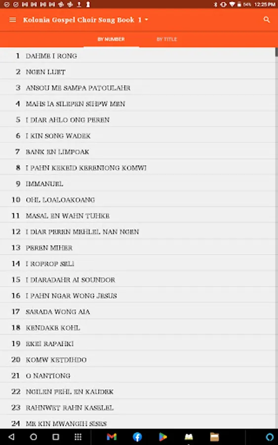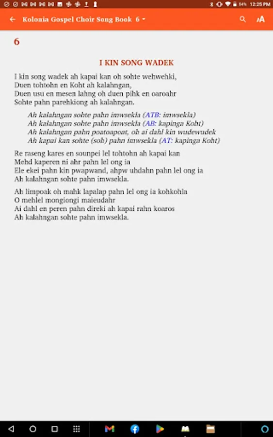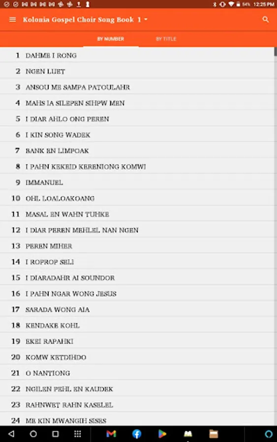 This App contains the Kolonia Gospel Choir Song Book, used in the Kepinle Church in Pohnpei. The song texts are in Pohnpeian and Mokilese.