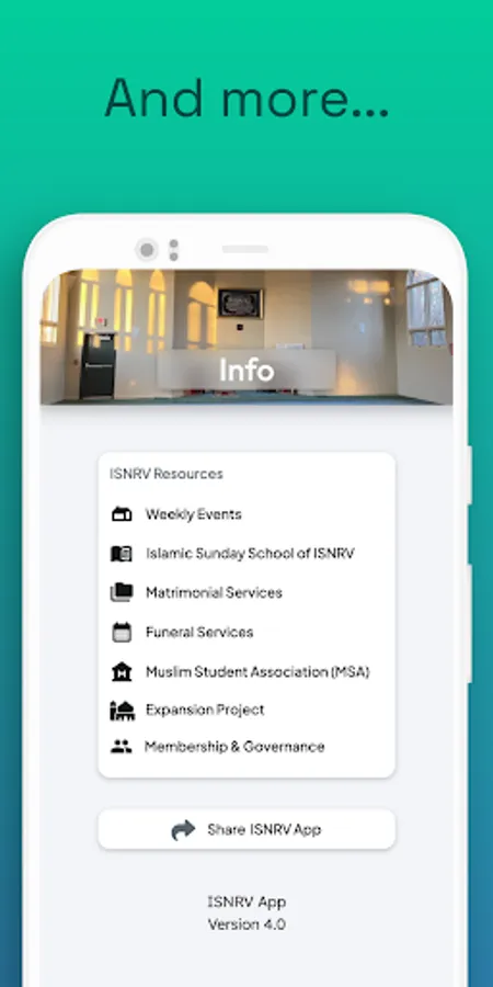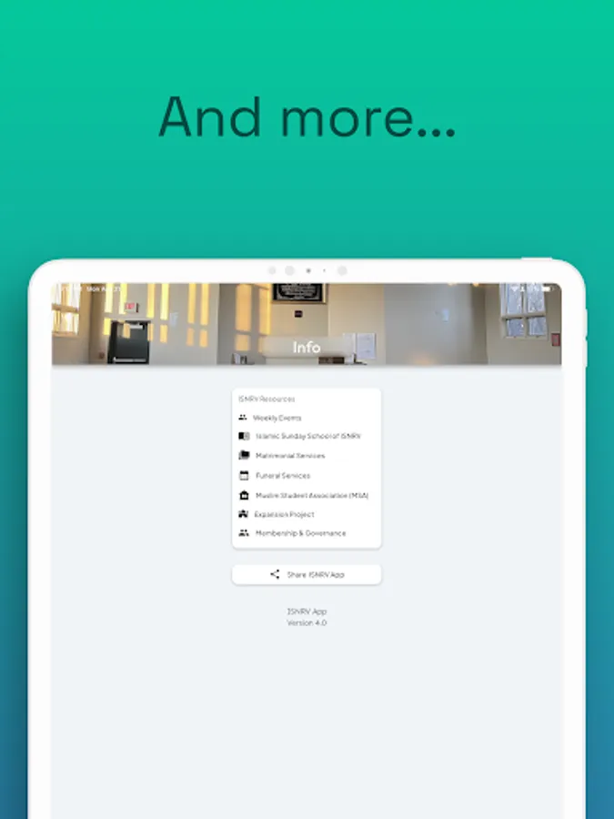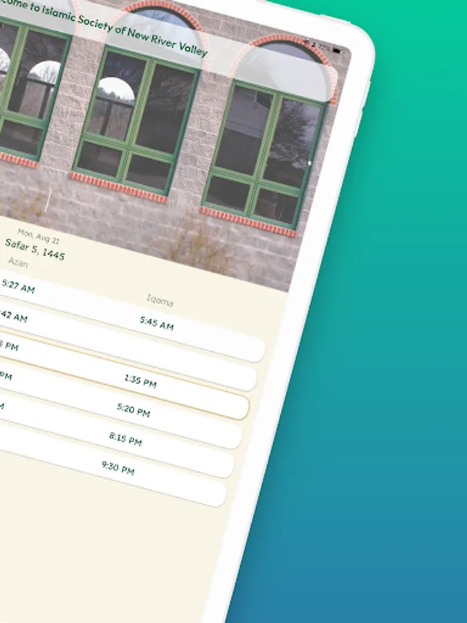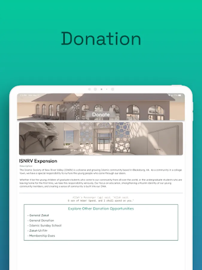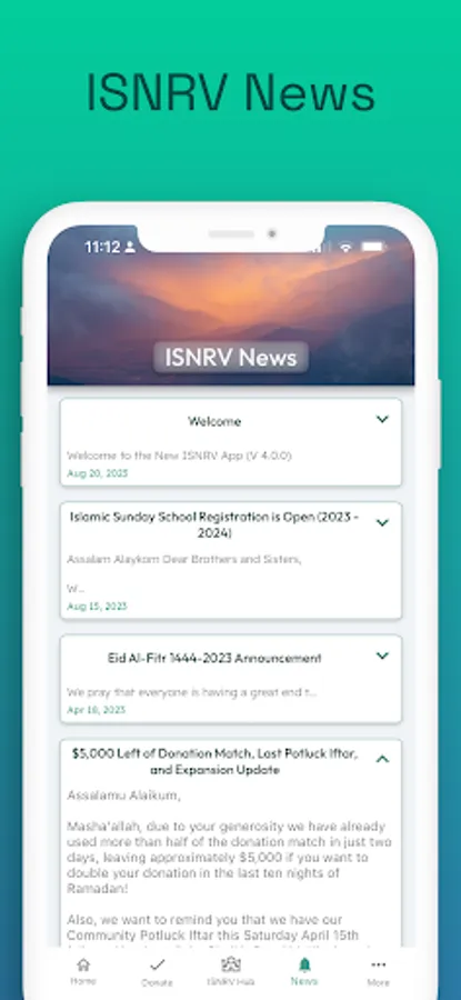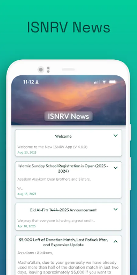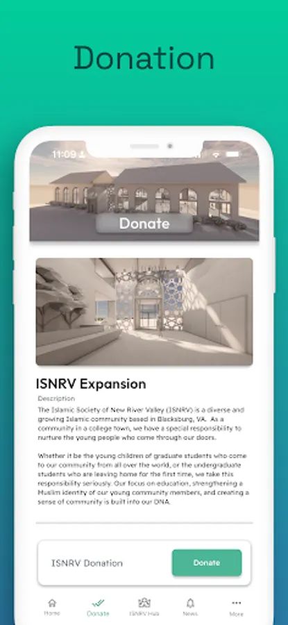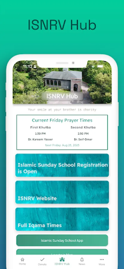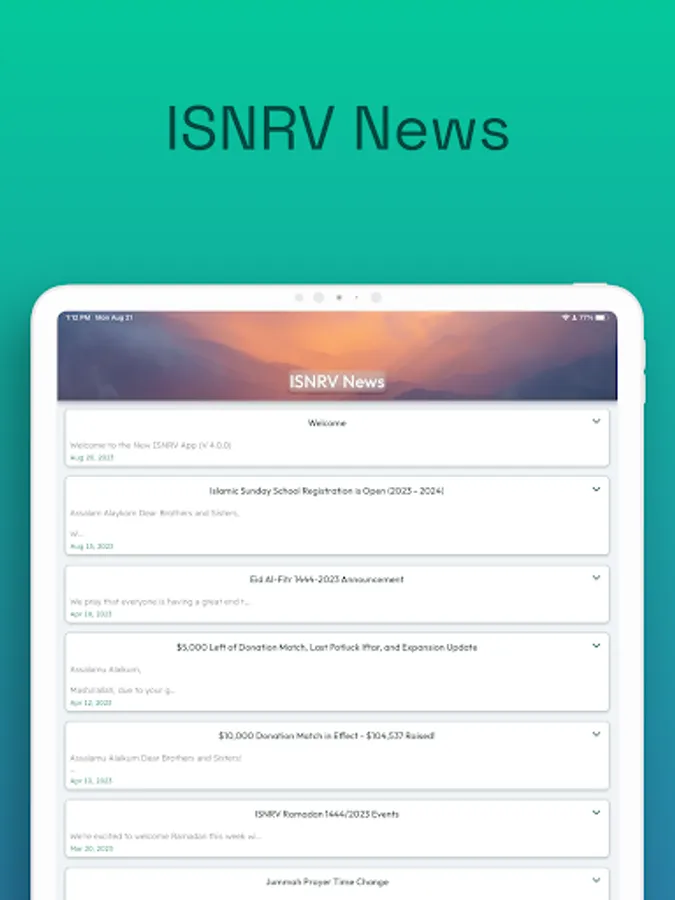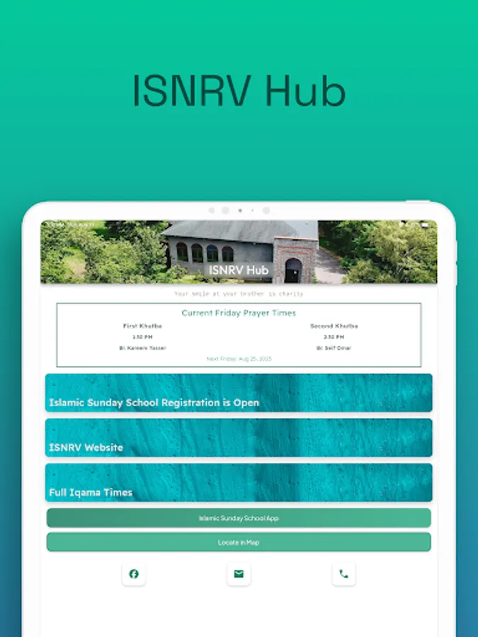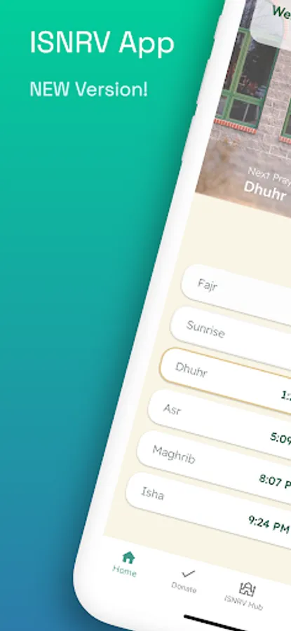 The ISNRV App aims to address the needs of the Islamic Society of New River Valley (ISNRV) in Blacksburg, VA. It provides Azan and Iqama timings, the most recent ISNRV News, and the ISNRV Hub featuring current events, Jumaa times, Khatib names, donation options, and more.