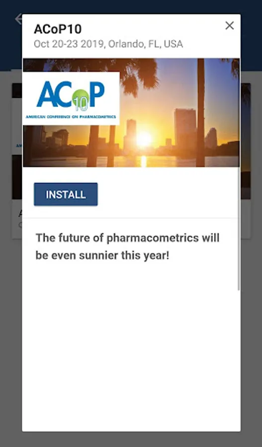 • Full conference support, including customizable program details, reminders, social functionality, searchable abstracts, floor plans and much more. As well as our annual ACoP meeting, conference app support will be extended to other pharmacometrics events around the world
