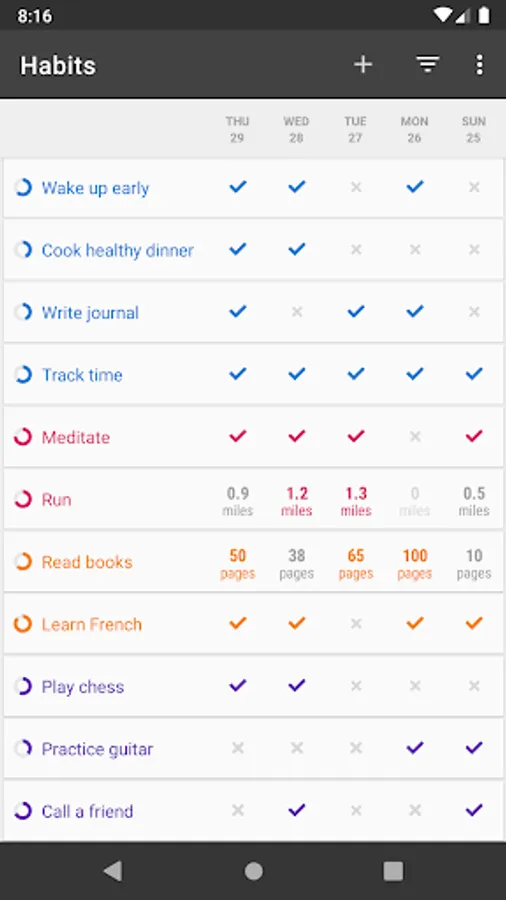 Supports not only daily habits, but also habits with more complex schedules, such as 3 times every week; one time every other week; or every other day.