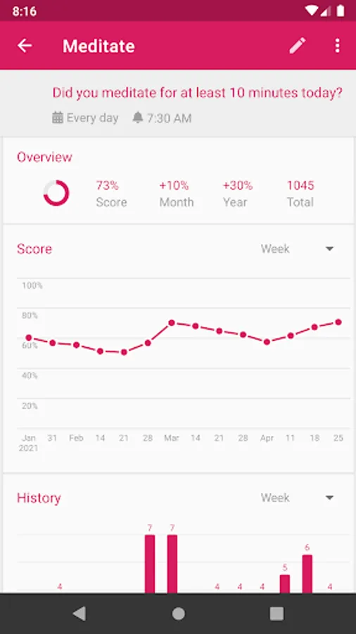 Clearly see how your habits improved over time with detailed charts and statistics. Scroll back to see the complete history of your habits.