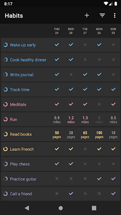Create an individual reminder for each habit, at a chosen hour of the day. Easily check, dismiss or snooze your habit directly from the notification, without opening the app.