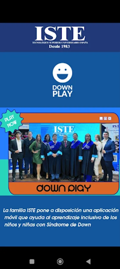 With the support of the TECNOLÓGICO SUPERIOR UNIVERSITARIO ESPAÑA ISTE, and its department for linking with society and research, a Down Play mobile application project has been generated to help inclusive learning of children with Down syndrome, through the Specialist Engineer Danilo Galarza M.B.A. as leader of the project and the national and international students of the Web Application Development Career such as: Fermín Tene, Jaime Murillo, Evelyn Rosado, Álvaro Quinzo.