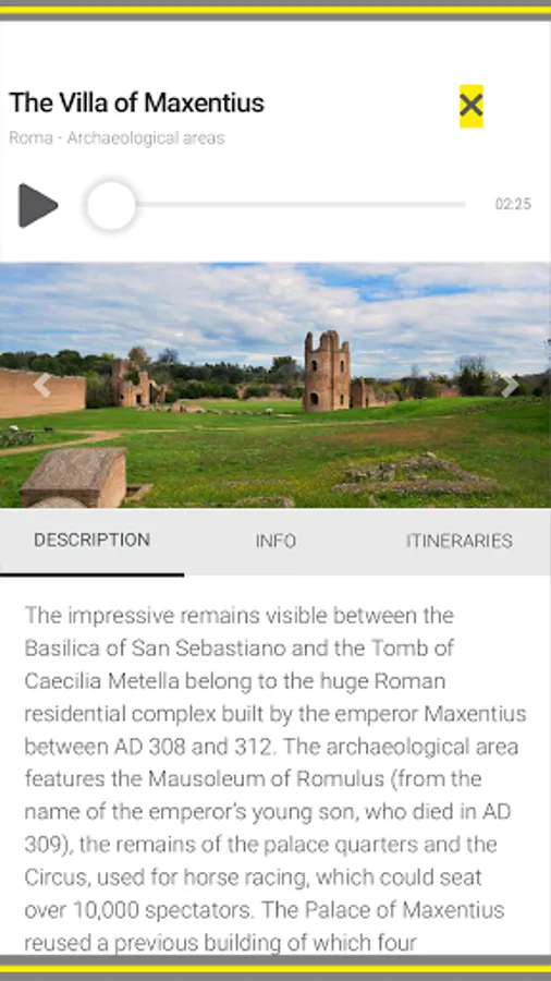 By photographing the QR codes on every panel, it will be possible to have information about each monument or archeological site of main interest or to start the itineraries proposed. Each itinerary is introduced by data on its practicability, a general description and a list of the stops included.