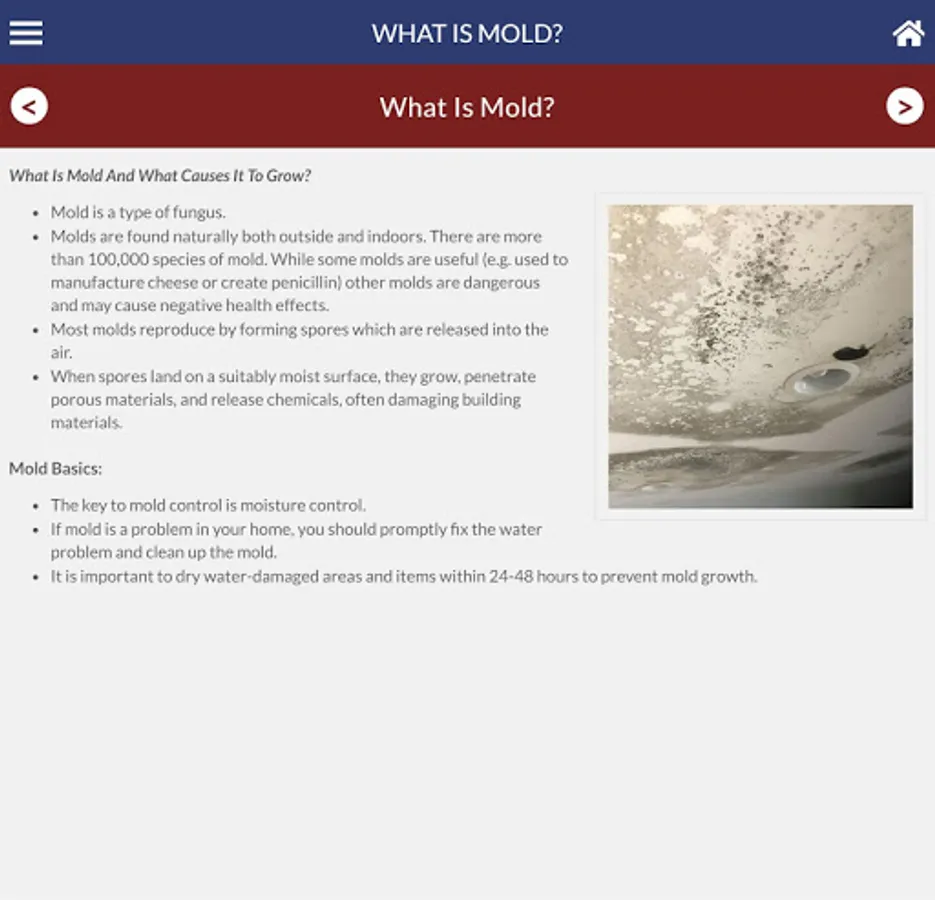 Work smart when cleaning up small-scale mold hazards in water-damaged homes. Learn about mold, how to identify the specific site hazards, and how to clean up safely. This app is designed for flood site workers, volunteers, and homeowners.
