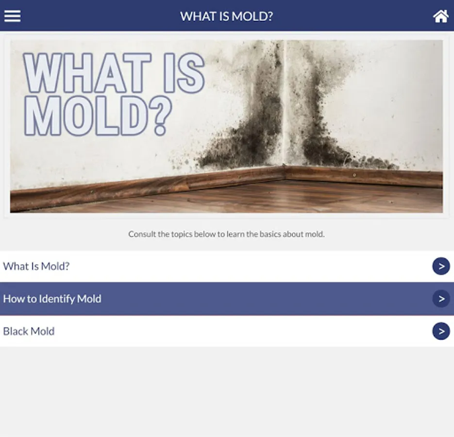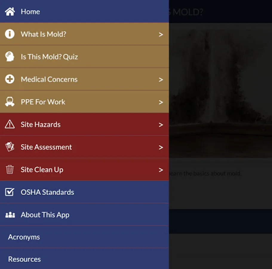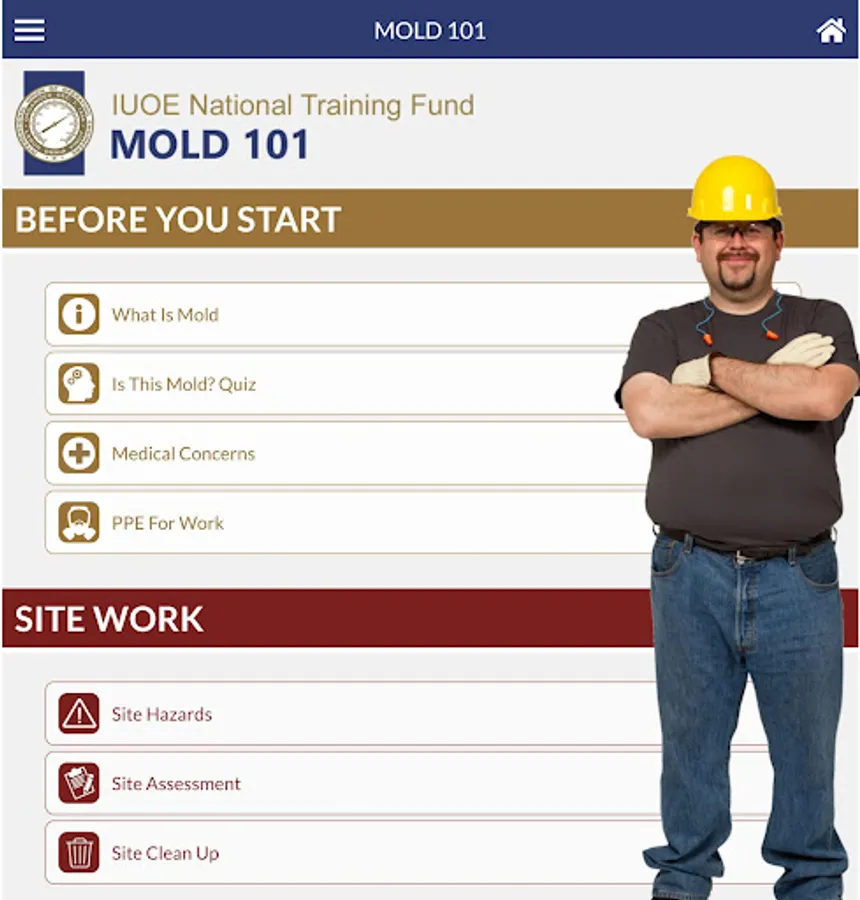 This mobile application was developed by the IUOE National Training Fund for small-scale projects of 10 square feet or less. For projects larger than 10 square feet, the U.S. CDC, U.S. EPA, and U.S. HUD all recommend using a qualified mold assessment and remediation specialist.