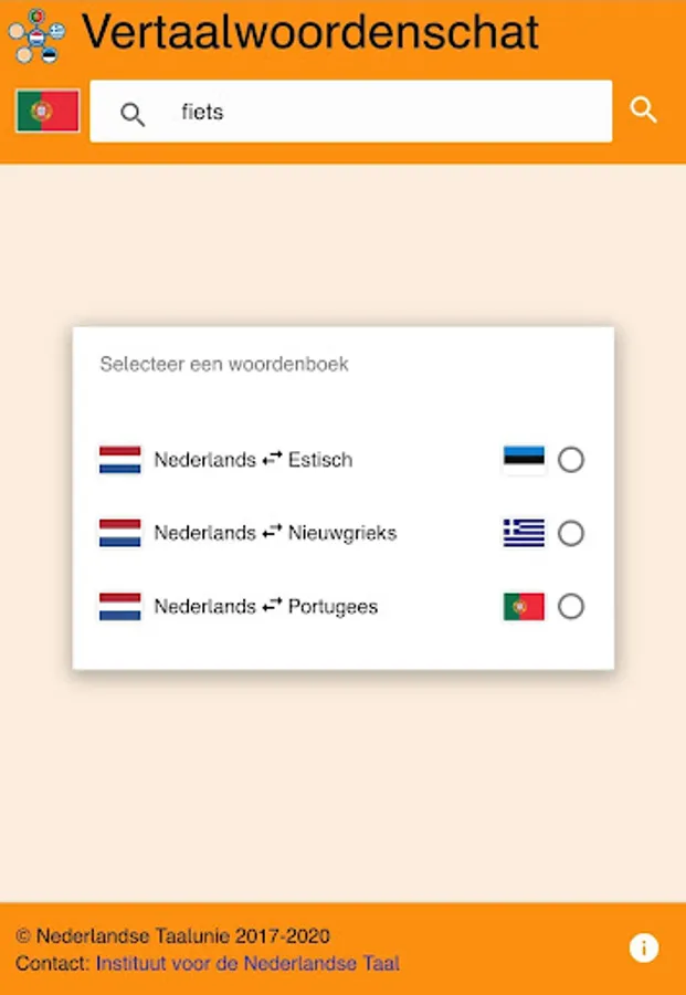 Application for bilingual dictionaries with Dutch as the source or target language. Currently, the Dutch - Estonian, Dutch - New Greek and Dutch - Portuguese language pairs are available free of charge.