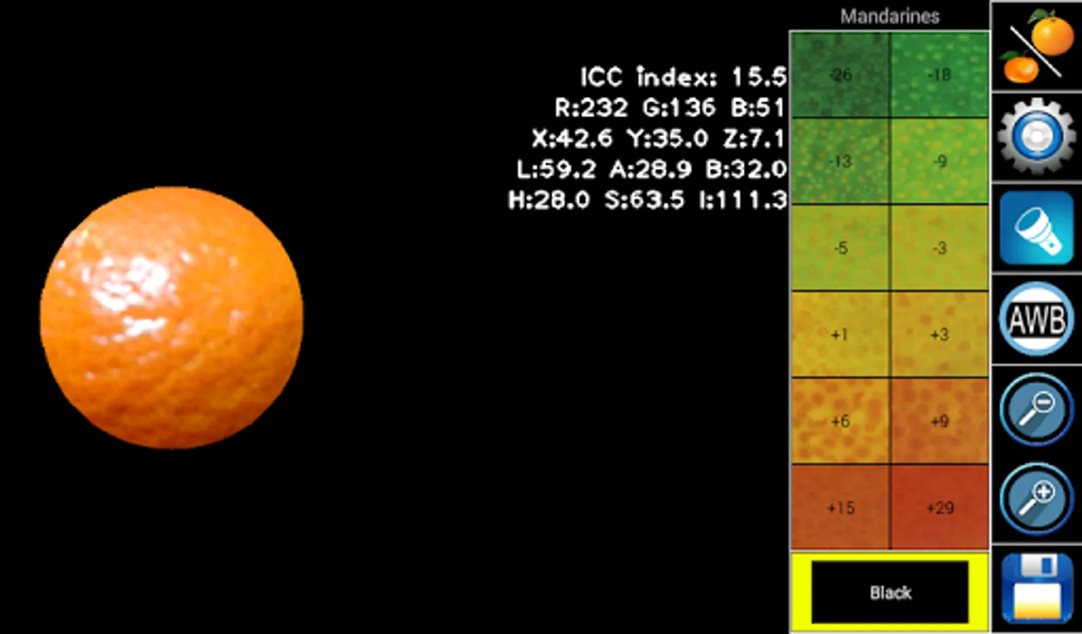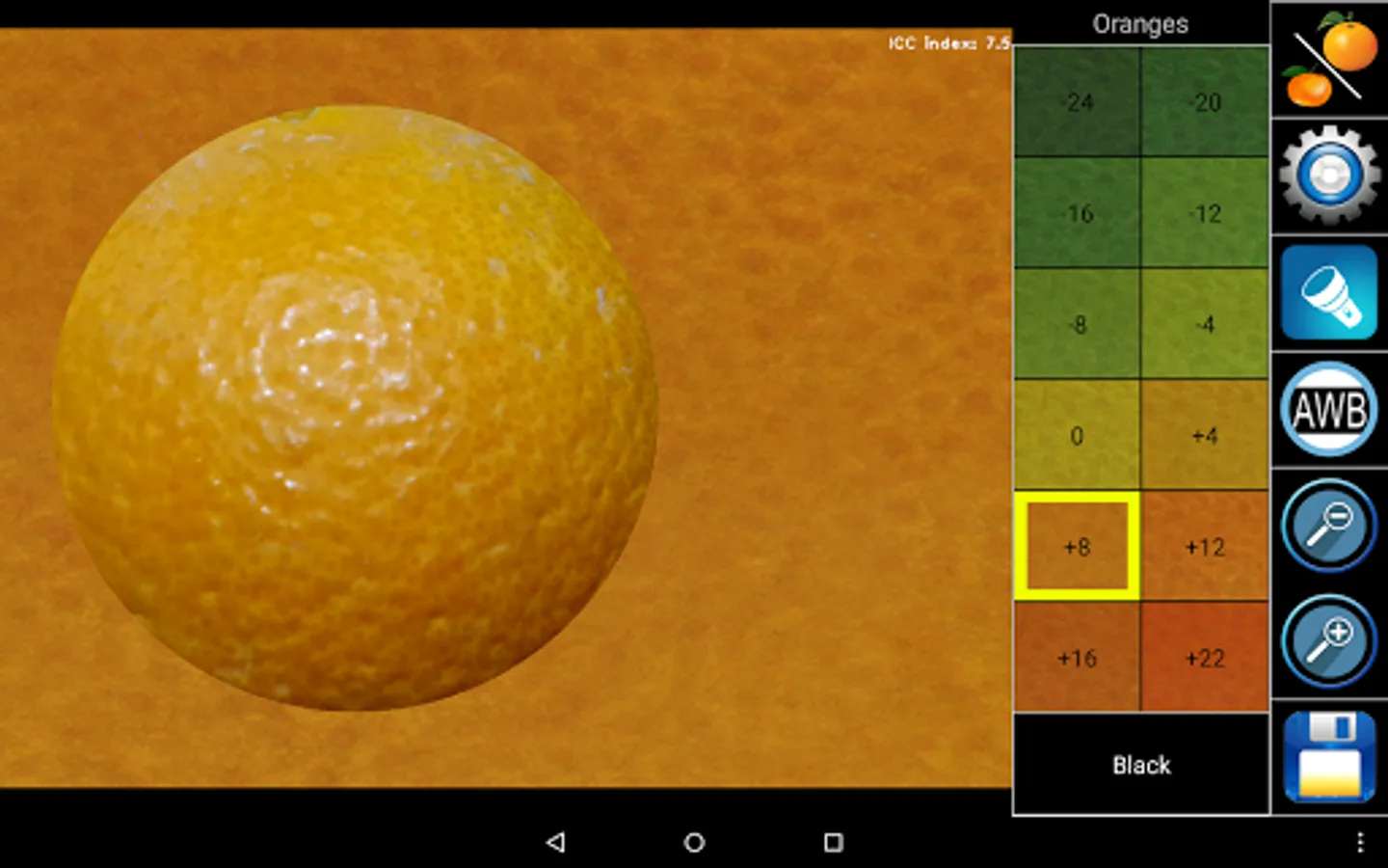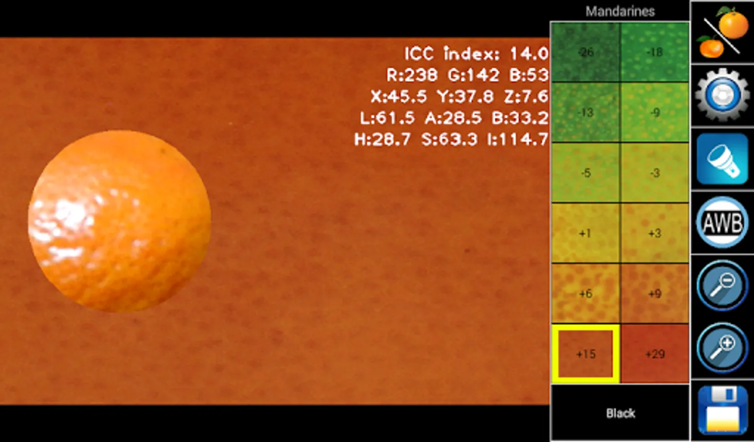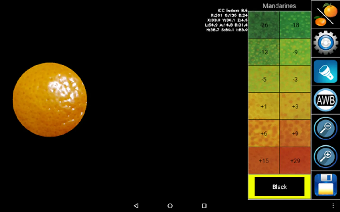 - When the application starts, several controls appear in a landscape format at the right of the display, reserving the left zone for capturing the image, from which we want to extract information about the ICC and other color spaces.