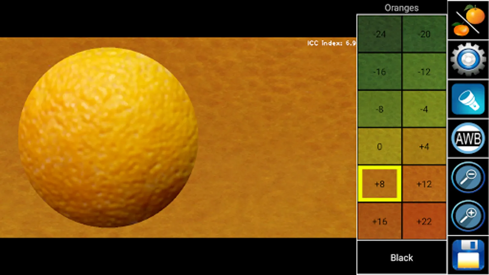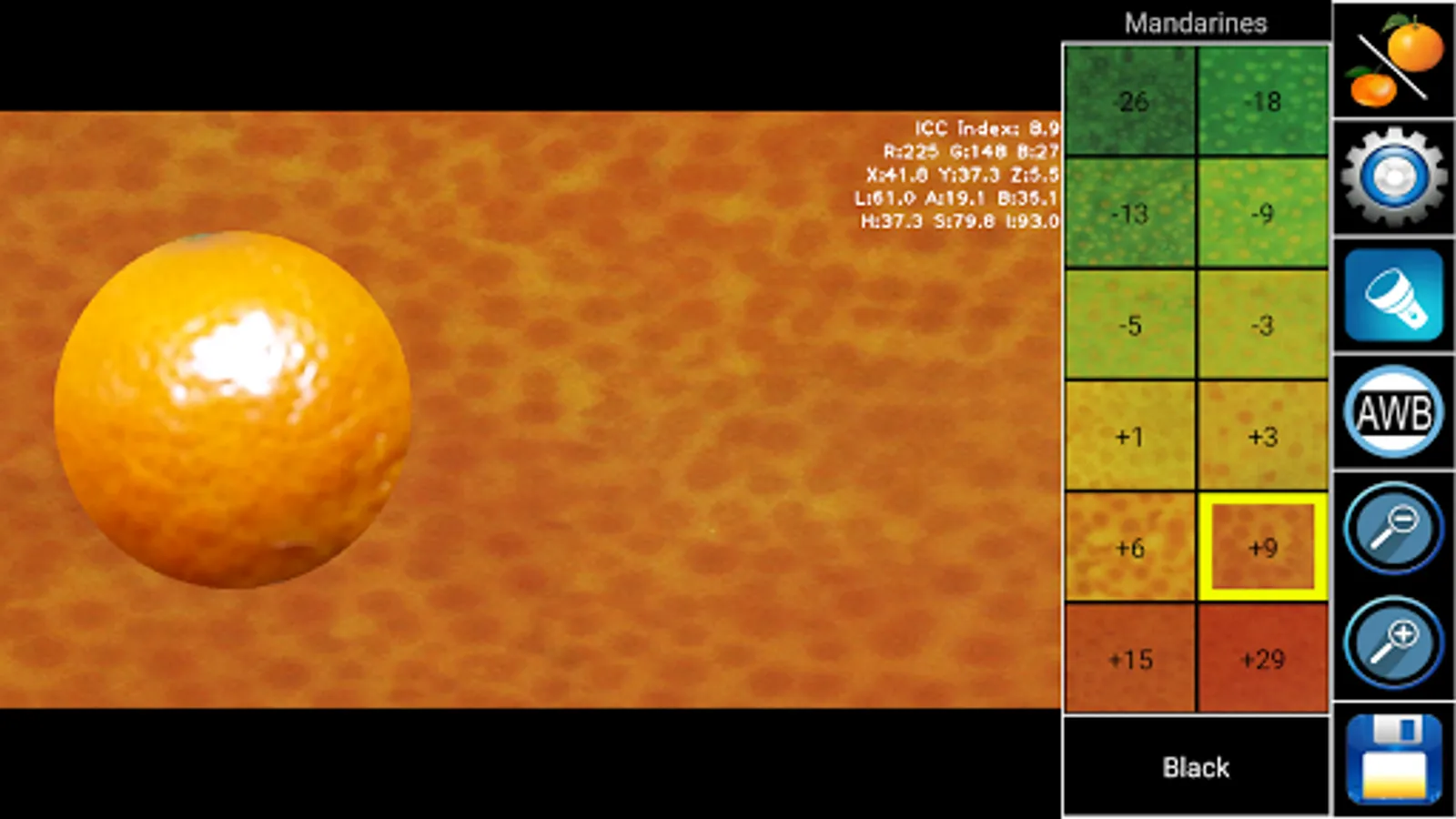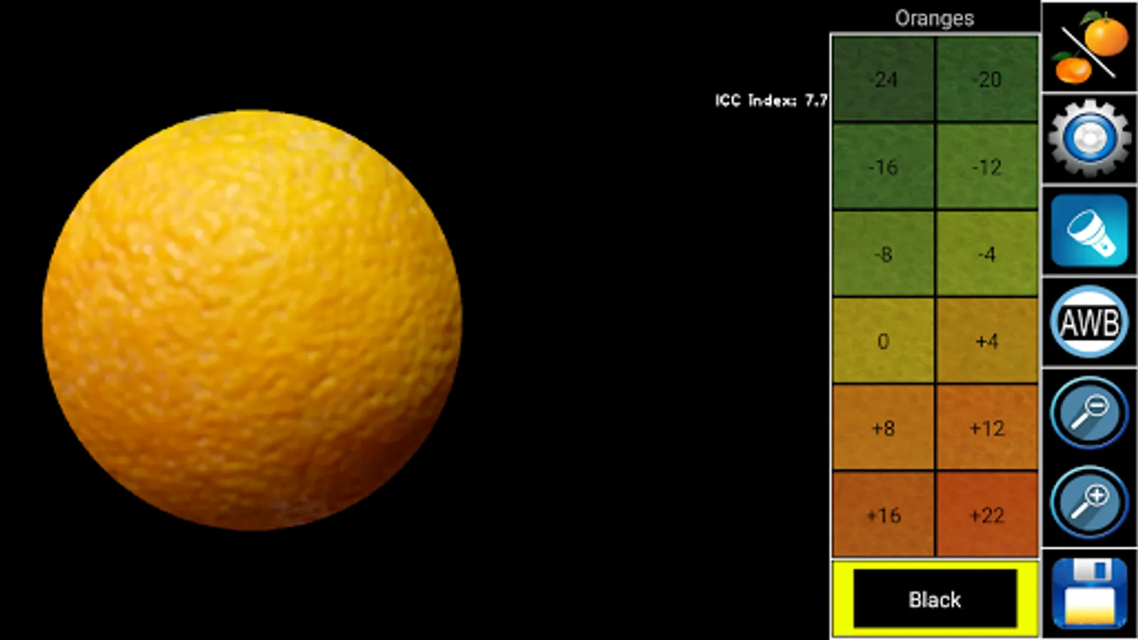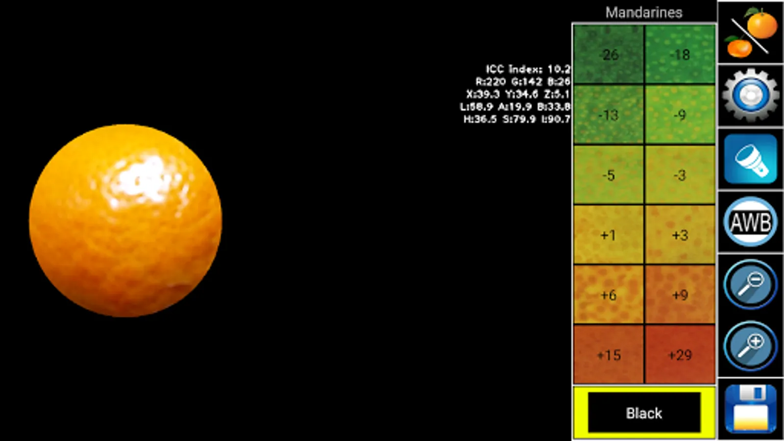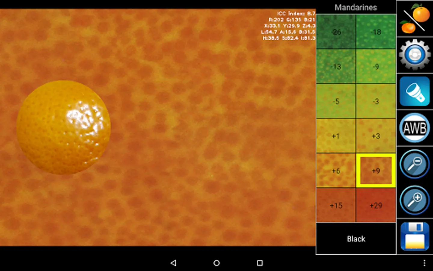 - When the application starts, several controls appear in a landscape format at the right of the display, reserving the left zone for capturing the image, from which we want to extract information about the ICC and other color spaces.
