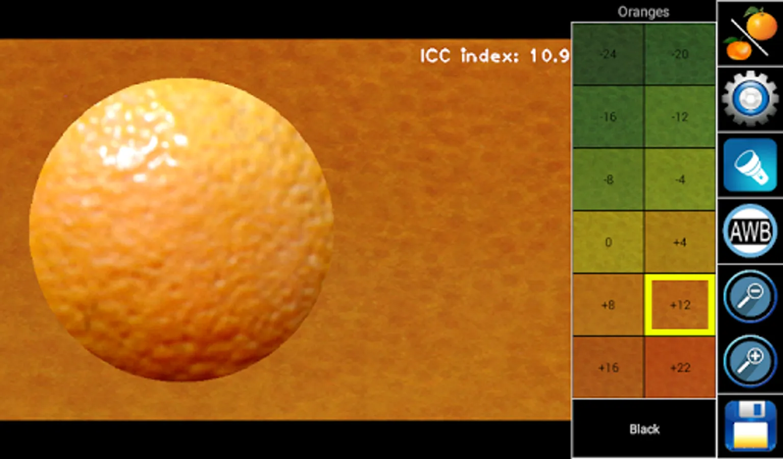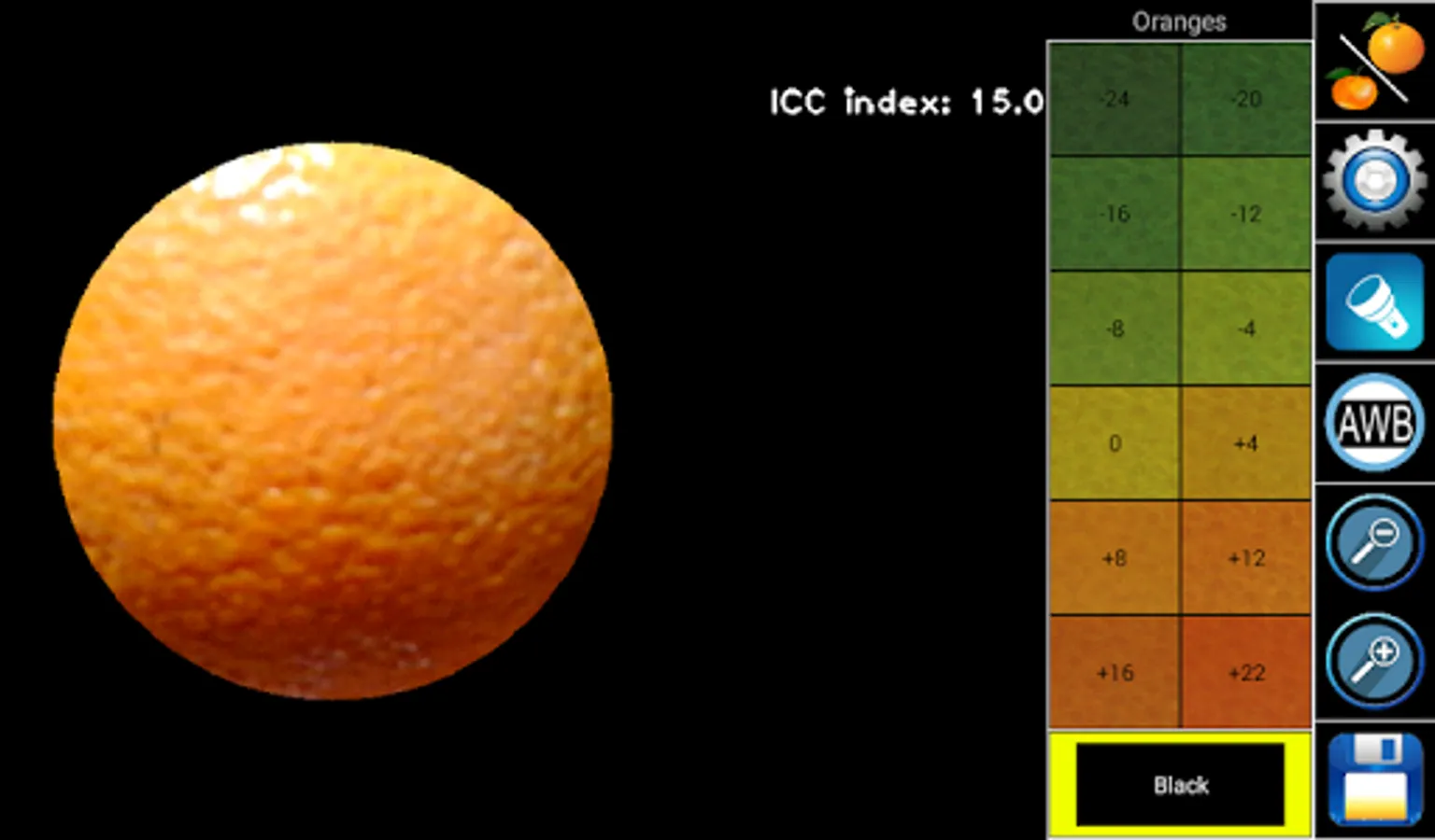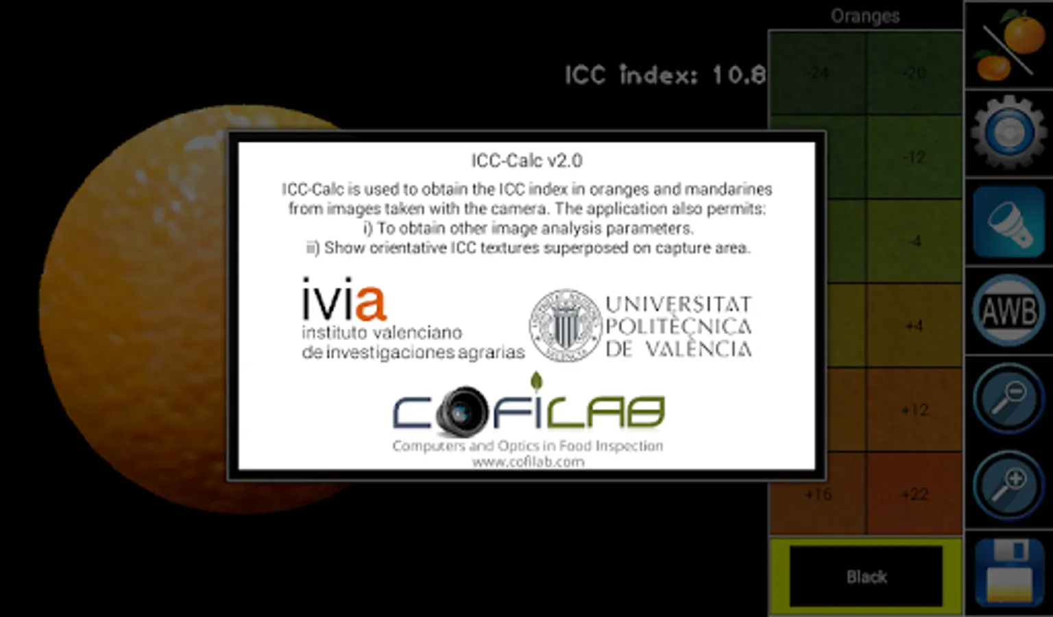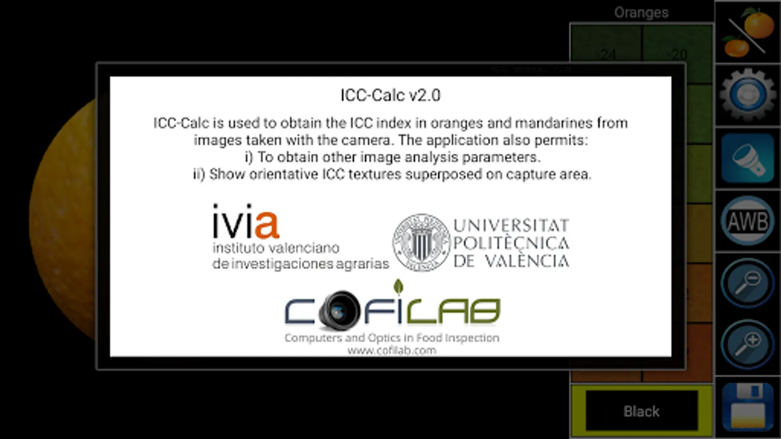 This application performs the Index Color Citrus in oranges and mandarines, allowing saving the results of the analysis in jpg format images. When ICC_Calc is initially installed, it starts the download of the OpenCv library by means of OpenCV Manager. This library is required for the image analysis of the application, and is totally safe. The process operates as follows: