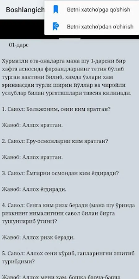 Bolamizning tarbashi mukammal bўlishiga erishish maksadida unga yoshligidan boshlab har sahadan shingil-shingil malumotlar berib borishimiz zhuda foydalidir. Bolani har bir narsa wa vokeadan ibrat olishga, tugri hulosa chikarishga ўrgatishimiz zarur. Bu ўrinda tarikh misollarga murozhaat kilishning ahamiyati katta. Ushbu kitobchaning usluba mana shu yўnalishdir. Unda olamning yaralishi hakid kiskach tushuncha beriladi. Alloch, din, paigambarlar wa hokazo boshka mawzular navbat bilan burma-bir zikr kilinadi. Darz davomida kerakli hulosalar chikarib boriladi. Bular booling yoshlik chogida bilib olishi zarur bўlgan birlamchi malumotlardir. Zero, bu bilimlar bolaning rukhiyatiga tasir kiladi, uni pokiza bows ketchirishga ўrgatadi.