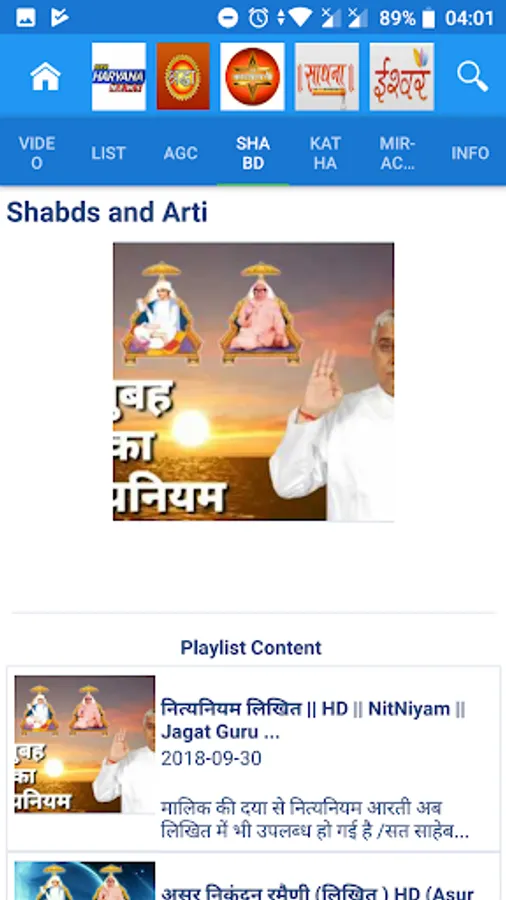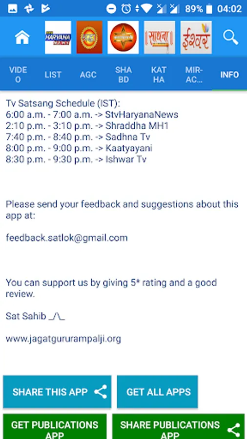 It plays video broadcast from Sadhna Channel. Satsang telecast on Sadhna Channel starts at 7.40 pm IST.