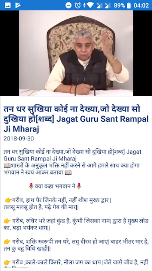 This android app is for watching Spiritual discourses of Satguru Rampal Ji Maharaj. It shows the path to achieve Moksha (Salvation). The satsangs give the gist of Vedas, Bhagavad Gita, Shri Guru Granth Sahib, Quran Sharif, Bible and many other religious scriptures. A major basis of these satsangs is "Kabir Vani" (Speech of God Kabir) and Garib Das Ji's Vani (of Chuddani, Haryana). This is only fact based & evidence based spiritual knowledge available in the world.