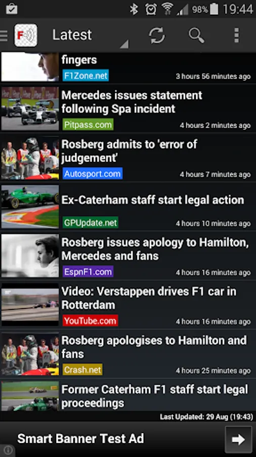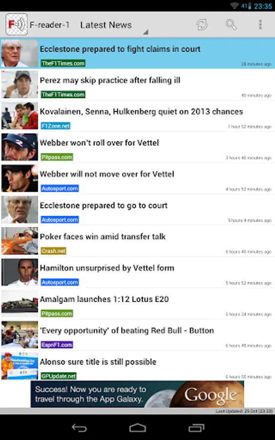 Freader1 includes Formula 1 rss feeds from AutoSport.com, BBC.co.uk, Crash.net, EspnF1.com, F1Pulse.com, F1Technical.net, F1Zone.net, Forumula1.net, GPUpdate.net, Pitpass.com , PlanetF1.com , SkySports.com , TheCheckeredFlag.co.uk , GrandPrixTimes.com and YouTube.com , but is not affiliated with them in any way.