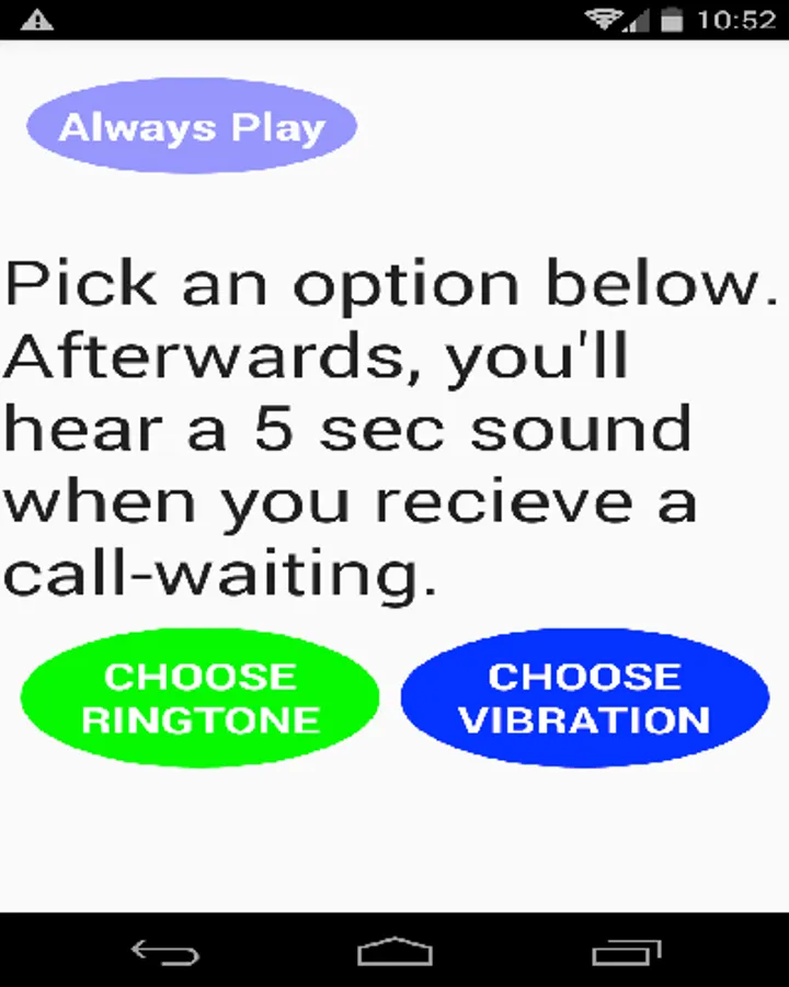 This is the paid version with no ads for the popular Call-Waiting Ringer app free version. It works the same as the free version but no wearable app attached. Please test out the free version first and if satisfied try this version. Works the exact same way only there should be no ads. Final sale.