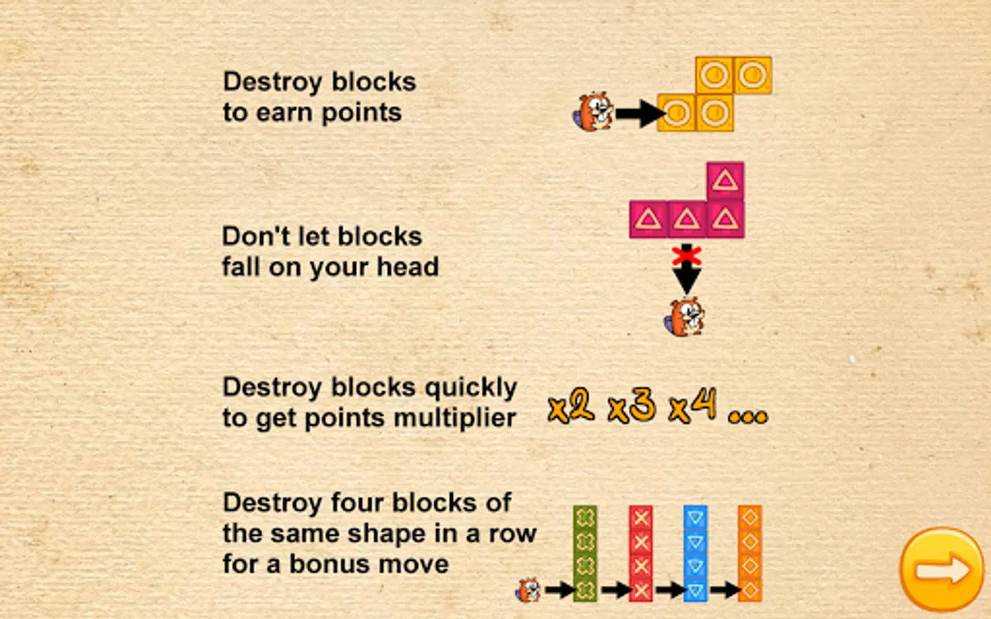 - If deliberate STRATEGIZING is your strength, collect four identical pieces in a row to give the Beaver brick-blowing superpowers.