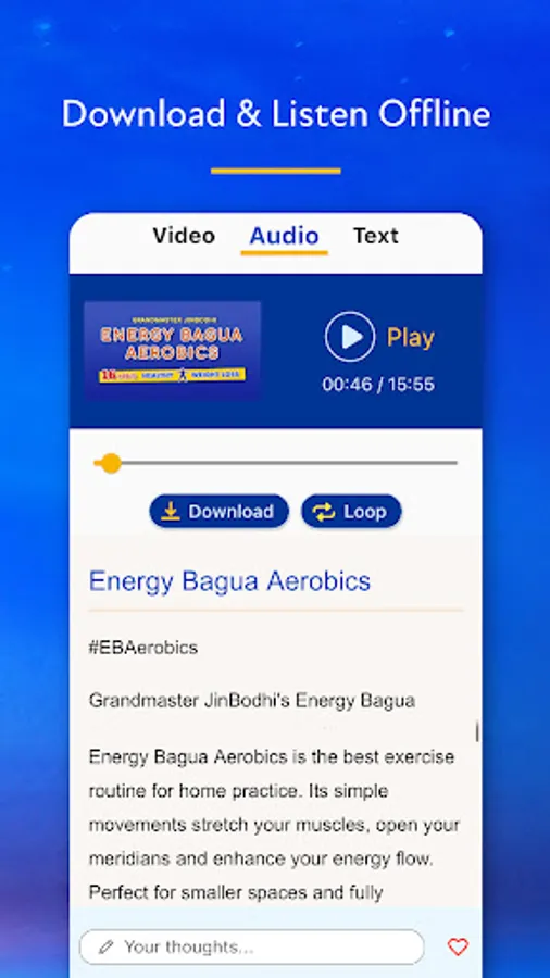 Grandmaster APP contains the finest teachings from Grandmaster JinBodhi, a great achiever of dharma, and effective easy-to-learn methods of practice. "Energy blessing" sessions help relieve stress, calm the mind, replenish energy and alleviate illness.