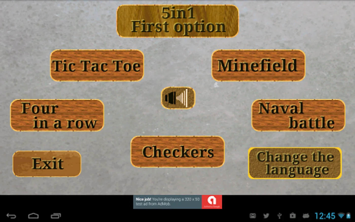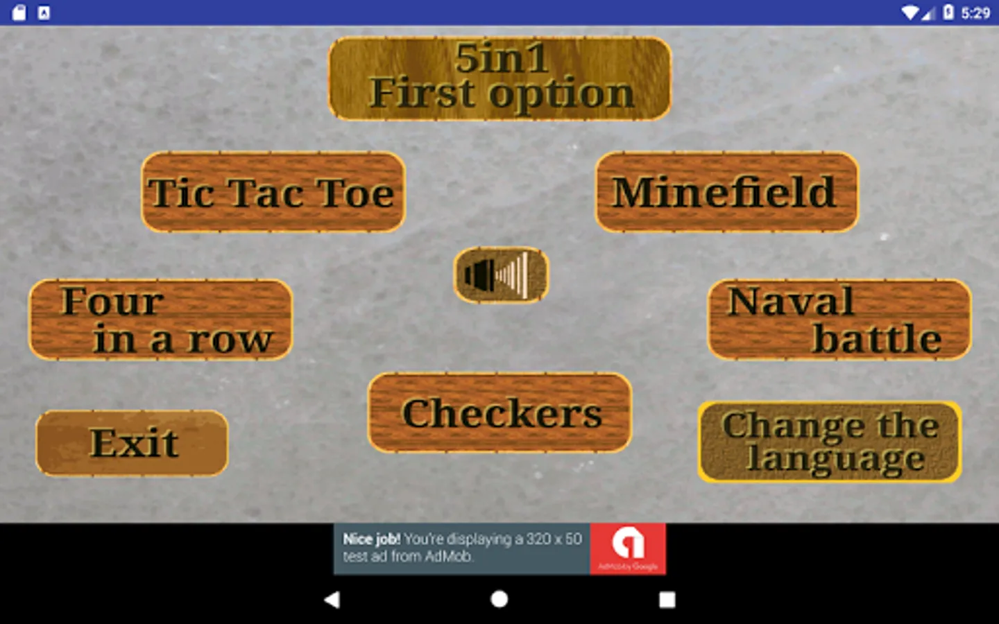 4 of them are typical board games (tic-tac-toe, four in a row, naval battle and checkers) for two players, allow the game against a not very challenging AI or two people in the same device or via bluetooth, and the fifth is the classic minefield.