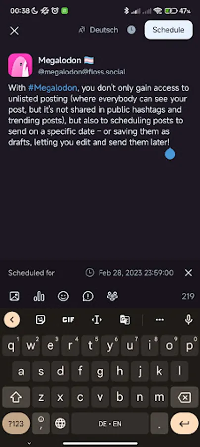 Megalodon is a modified version of the official Mastodon Android app adding important features that are missing in the official app, such as the federated timeline, unlisted posting and an image description viewer.
