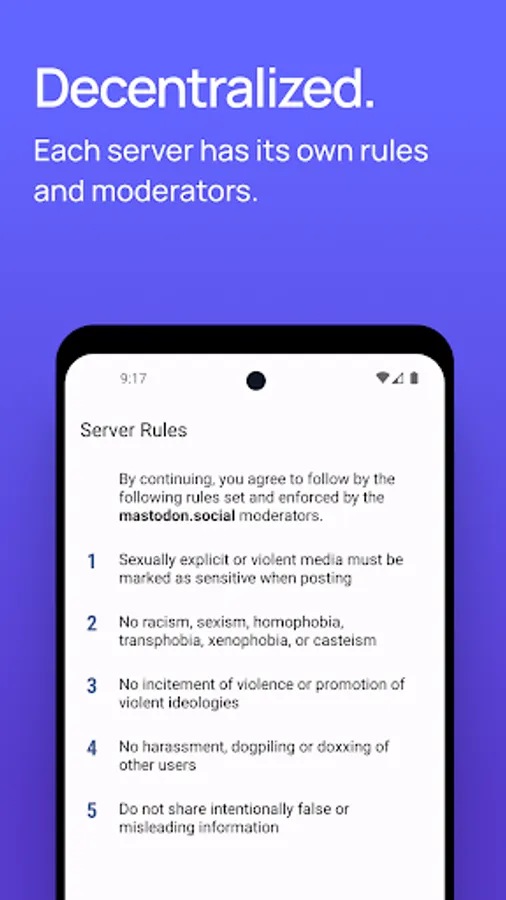 Mastodon is built with a focus on privacy and safety. Decide whether your posts are shared with your followers, just the people you mention, or the whole world. Content warnings let you hide posts containing sensitive or triggering material until you're ready to engage with them. Each community has its own guidelines and moderators to keep its members safe, and robust blocking and reporting tools help prevent abuse.