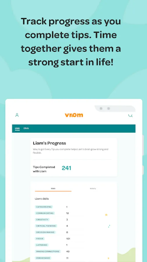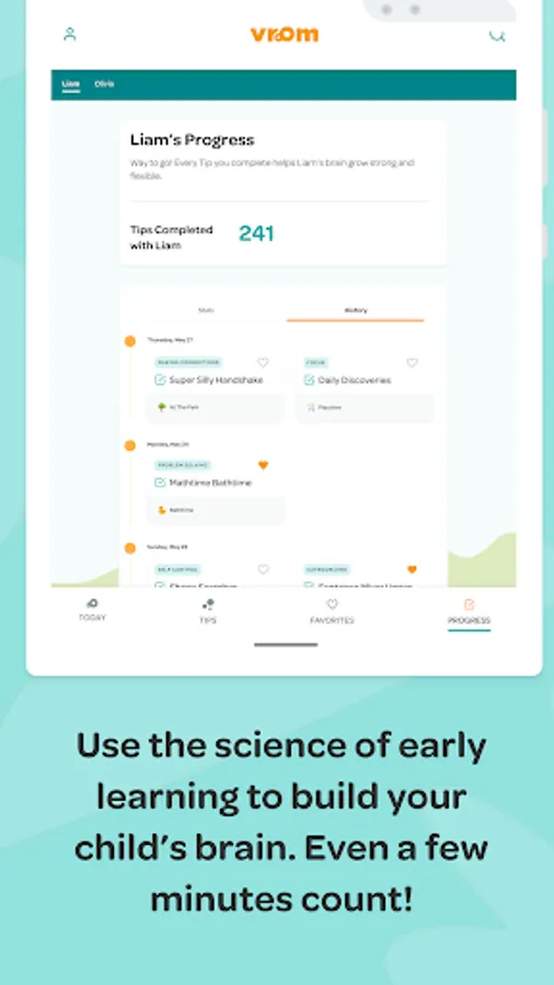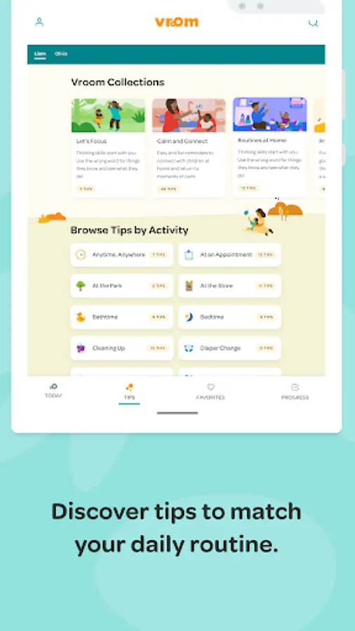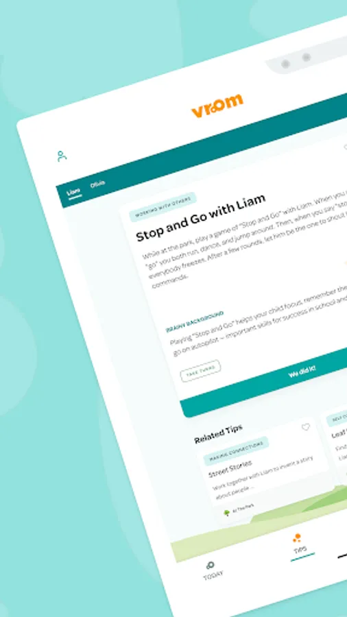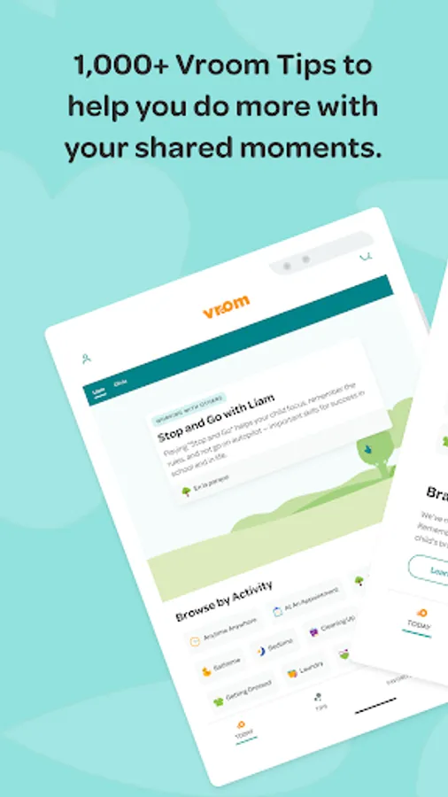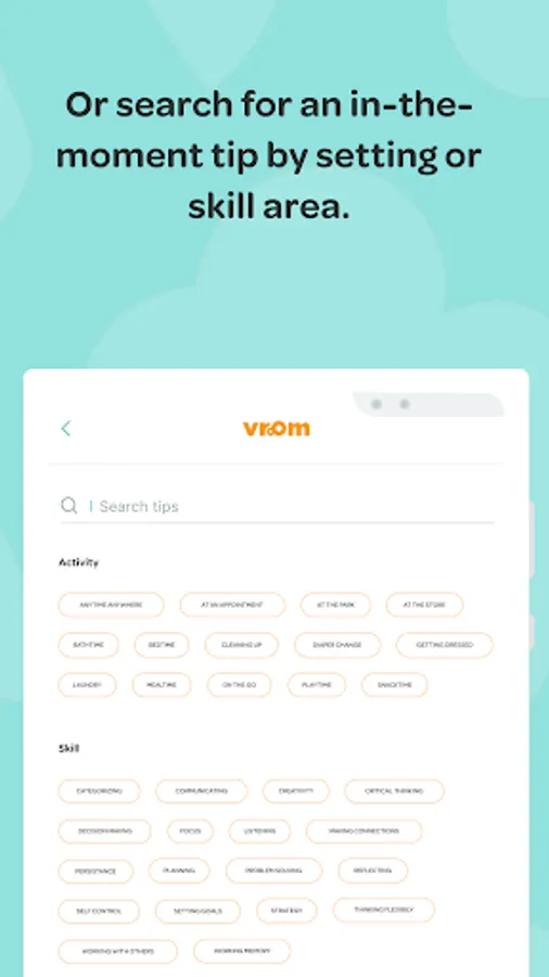 - Every day, we feature a Vroom Tip for your child’s age range, ready when you open the app.
