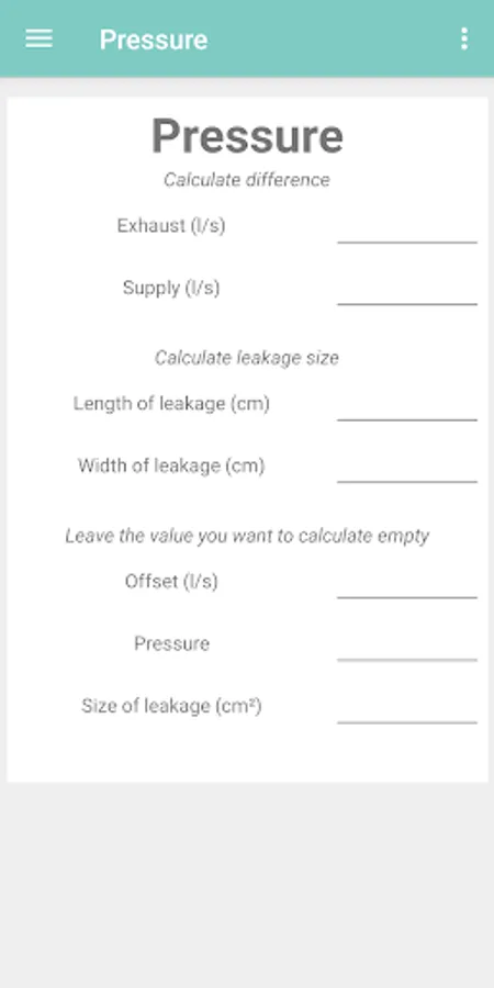 - Calculate roompressure with the helt of size of leakage and the present supply and exhaust
