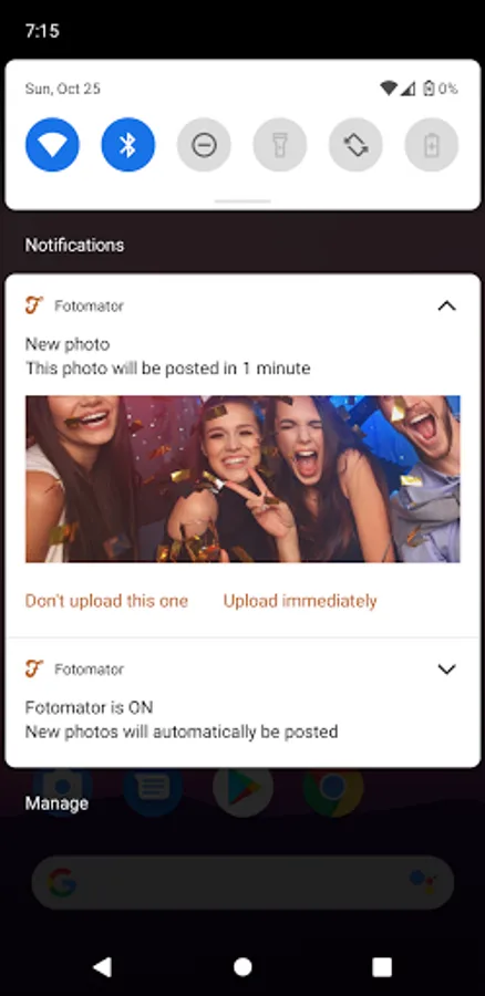 To avoid sharing anything you'd like to keep private, every time a photo is taken, first, a notification with a preview of the photo will be visible for a minute, which gives you time to discard the photo before it is shared. You can also use this notification to share the photo immediately.