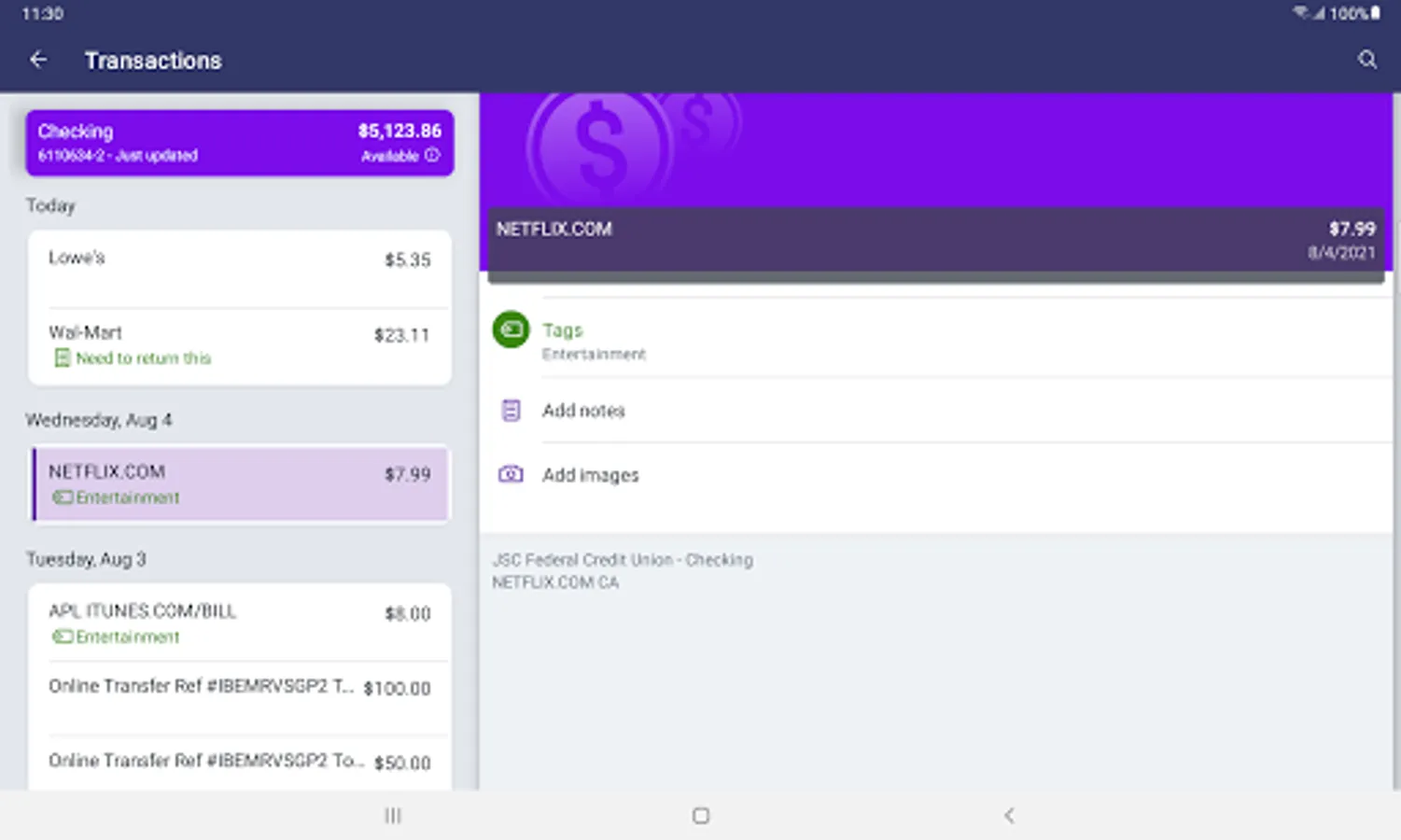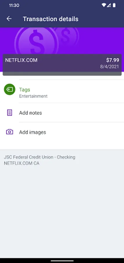 Keep your transactions organized by adding tags, notes, and photos of receipts to your account history.
