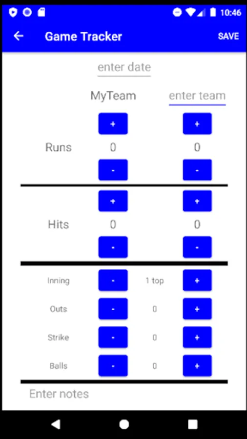 I originally created this app to track my kid's baseball games, then expanded it to keep a record of each game in the season. Your team name can be entered in the Settings menu and it will be entered into each new game. The fields will increment and reset in a logical way (e.g., if there are 2 outs and you hit the "+ out" button again it will reset the outs/balls/strikes, if you hit the "+ hit" button it will also reset the balls/strikes, etc). Entries in the Season Tracker screen can be deleted by long pressing. Short pressing will show the runs, hits, and game notes.