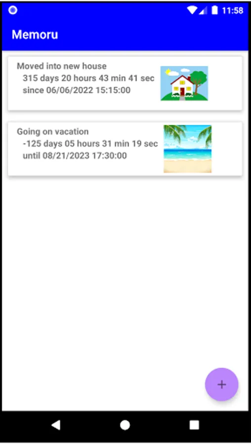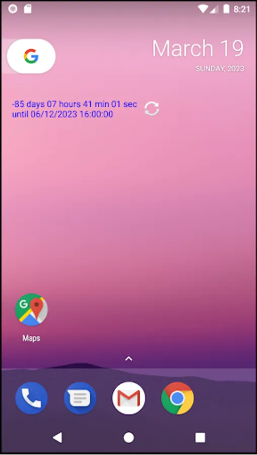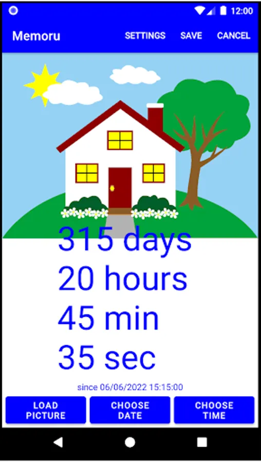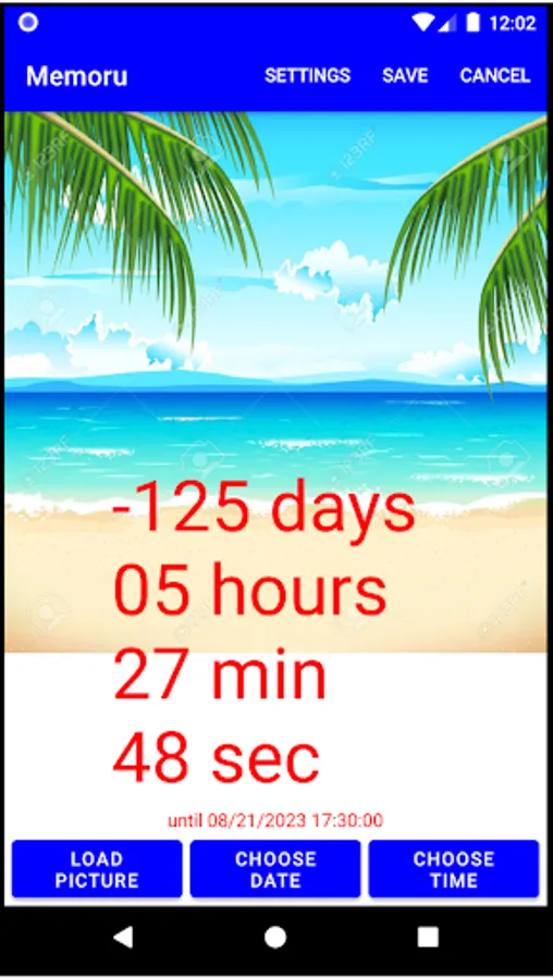 This app will show how many days/hours/minutes/seconds have passed since a certain date and time (or how much time until a certain date/time in the future). The time is superimposed on the picture of your choice. You can change the text size, color, and position as well as the position of the picture. Multiple dates/times can be stored (items can be deleted by long-pressing). There is also a widget available that will automatically refresh one date/time after 30 minutes or can be manually refreshed with a button in the widget.