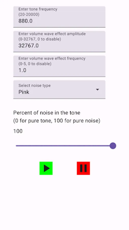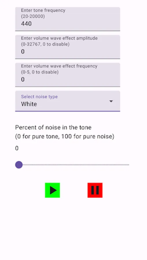 This app will play pure audio tones and three different colors of noise (white, pink, or brownian). The tone and noise can be mixed with the slider. The volume can be modulated to produce a wave effect. The audio must be paused and restarted to pick up any parameter changes.
