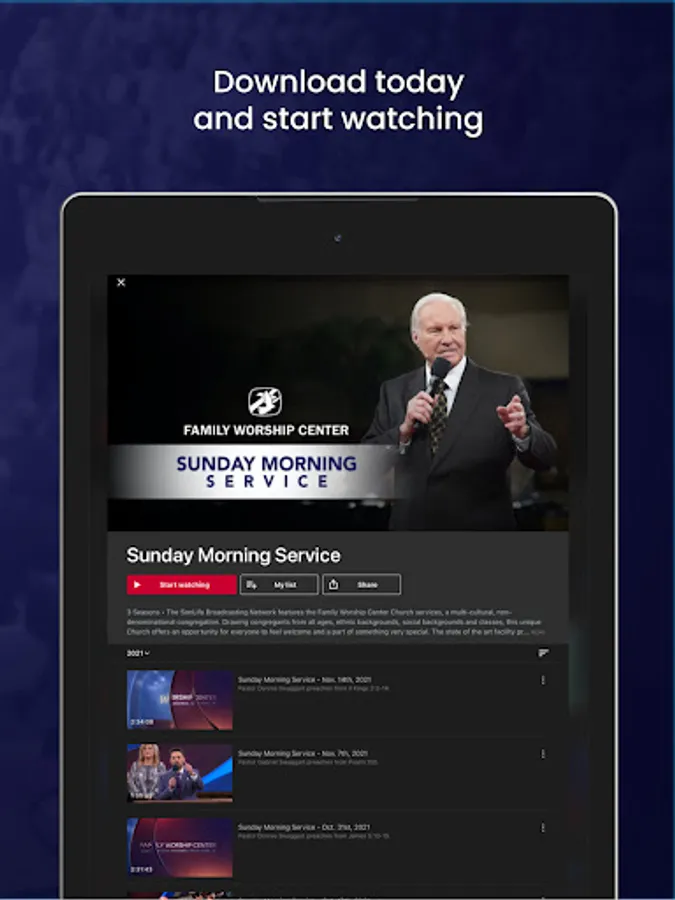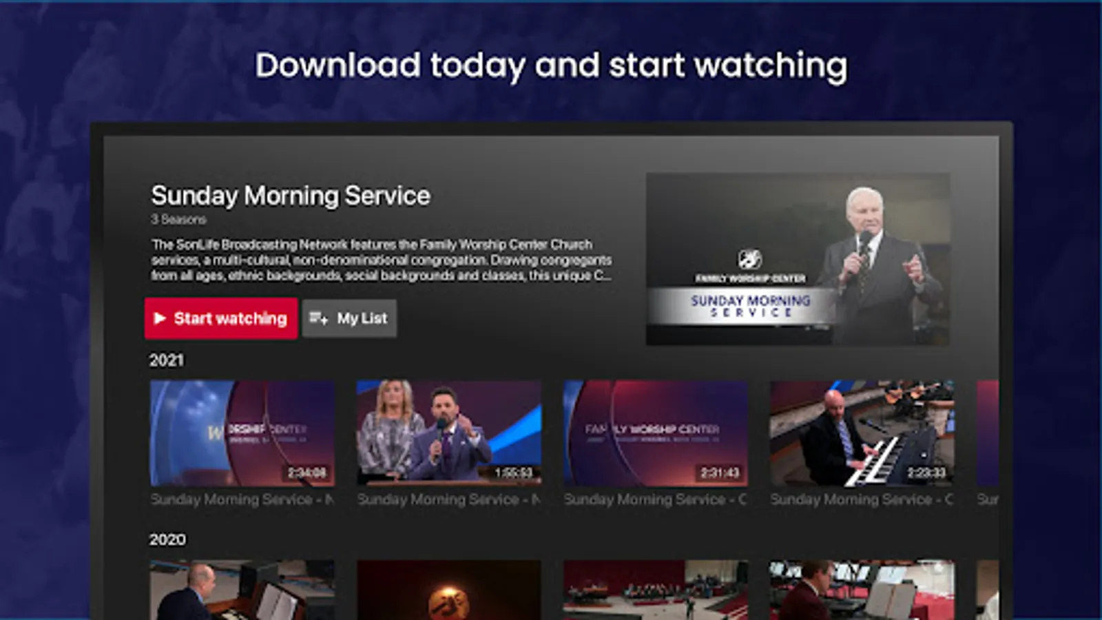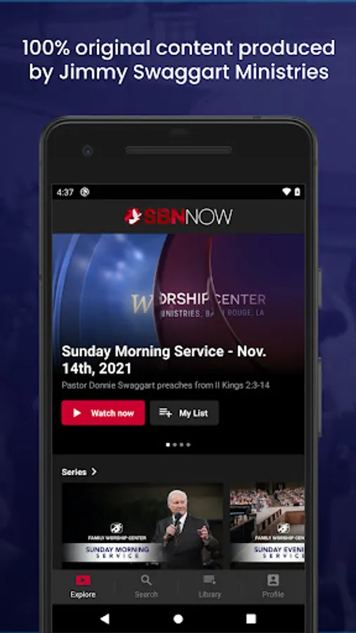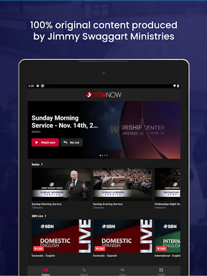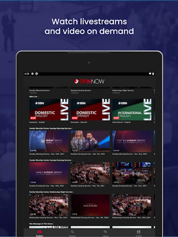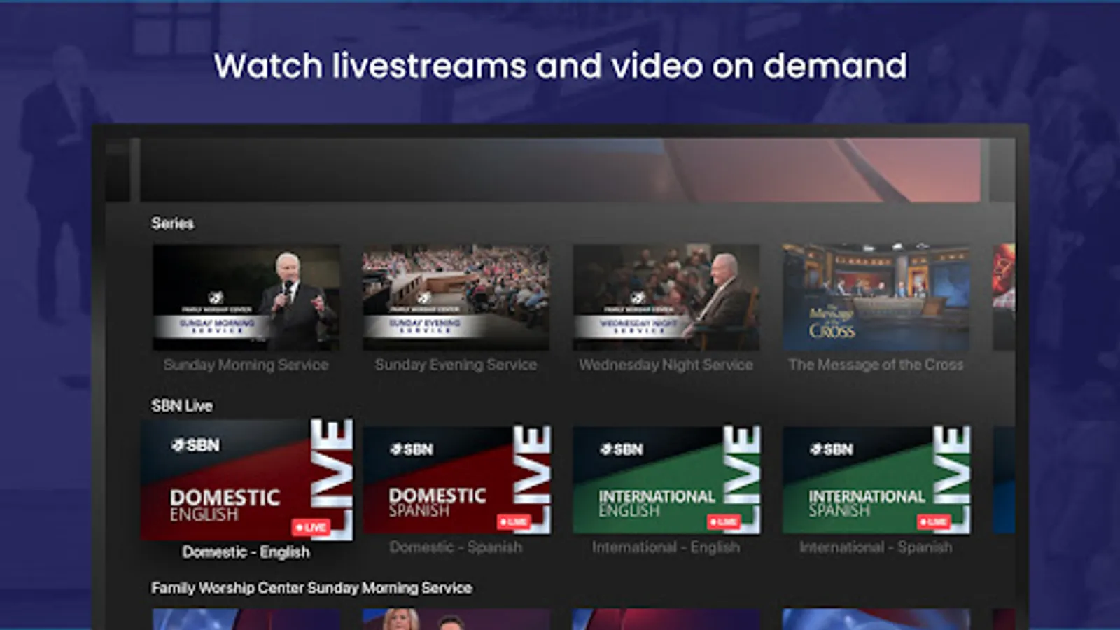Watch the Sonlife Broadcasting Network live and on demand wherever you are! SonLife Broadcasting Network includes 100% original content produced by Jimmy Swaggart Ministries. The new SBN Now app includes the live stream in English, Spanish and Portuguese as well as Video on Demand! You can now enjoy programs like Family Worship Center Live, The Message of the Cross, Frances and Friends, A Study In The Word and The Classic Crusades right in the SBN Now app!