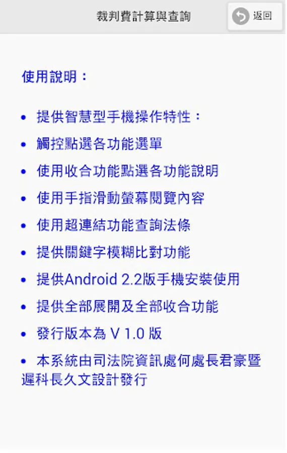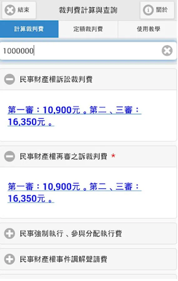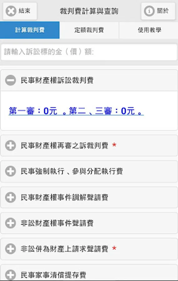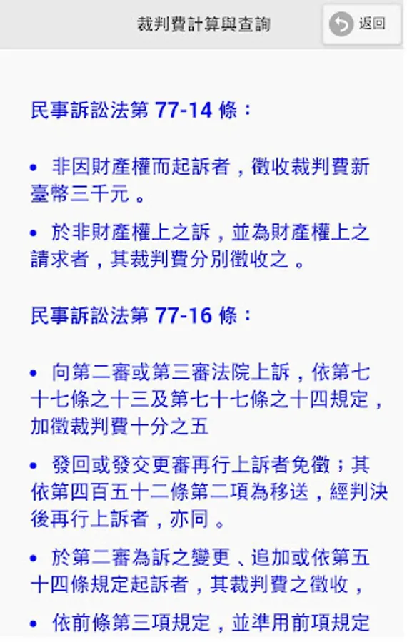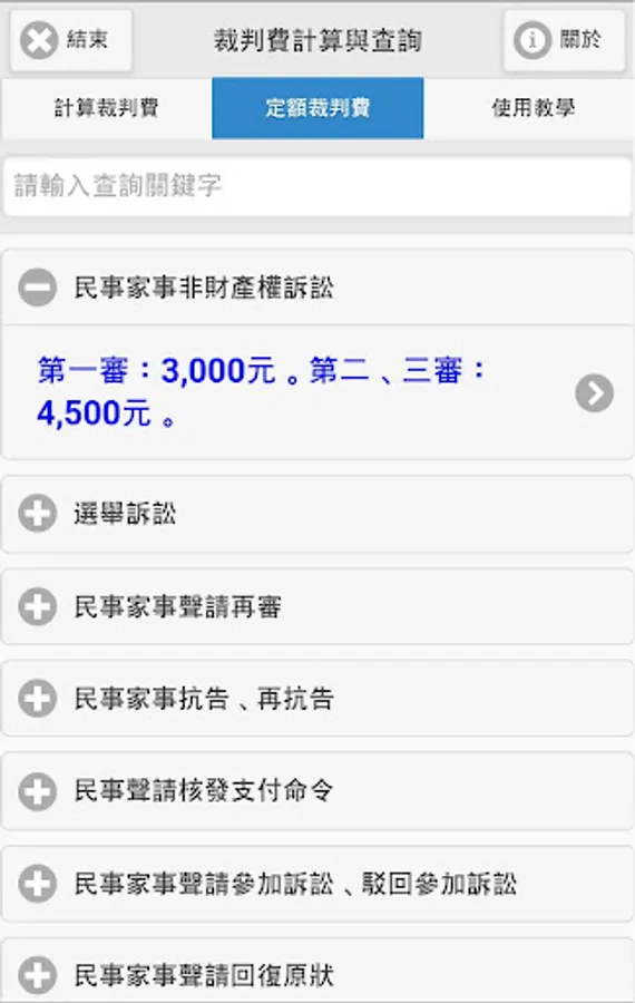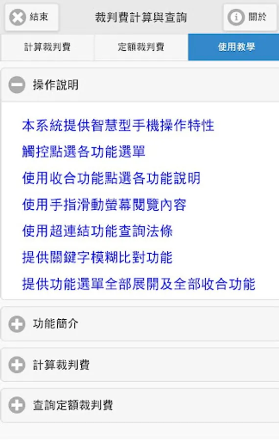 民事訴訟事件、非訟事件、家事事件、行政訴訟並提供關鍵字模糊比對、超連結顯示法條內容依據及操作說明。