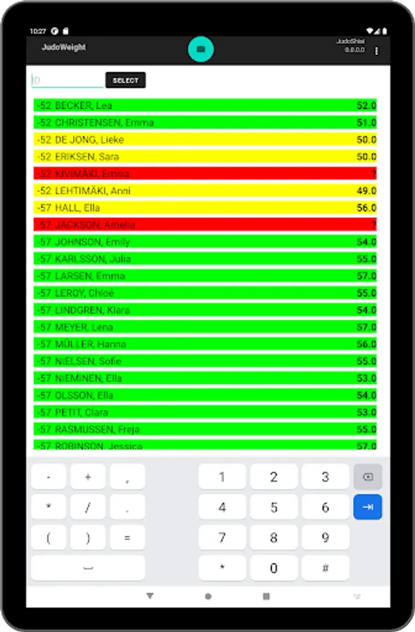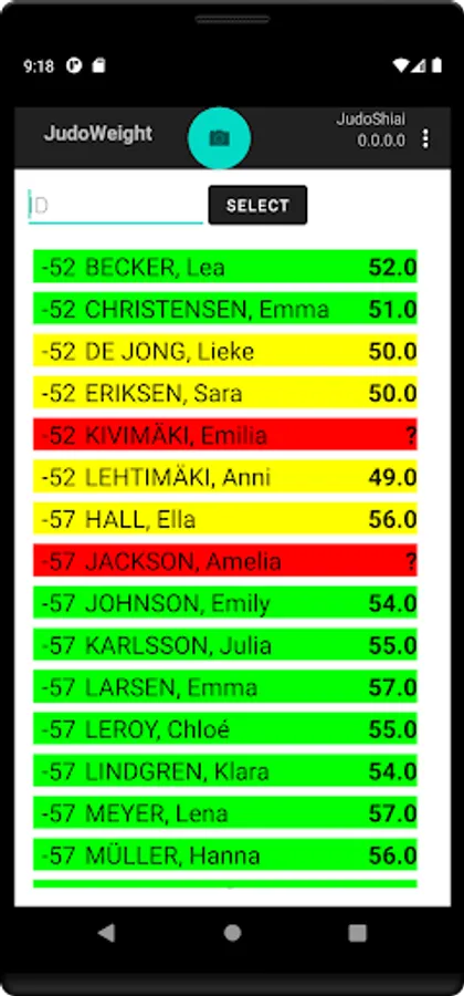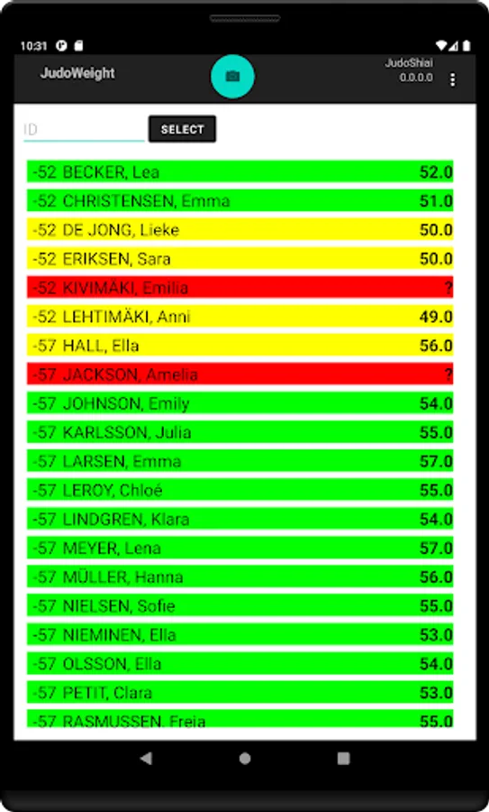 JudoWeight scans barcode or QR code and gets information about competitor. Competitor's weight is typed in and saved to the local database. Collected weights can be sent to JudoShiai by Wi-Fi, by saving to a file in cloud services like Dropbox, or email.