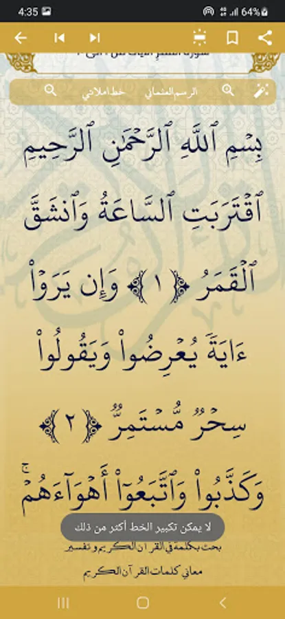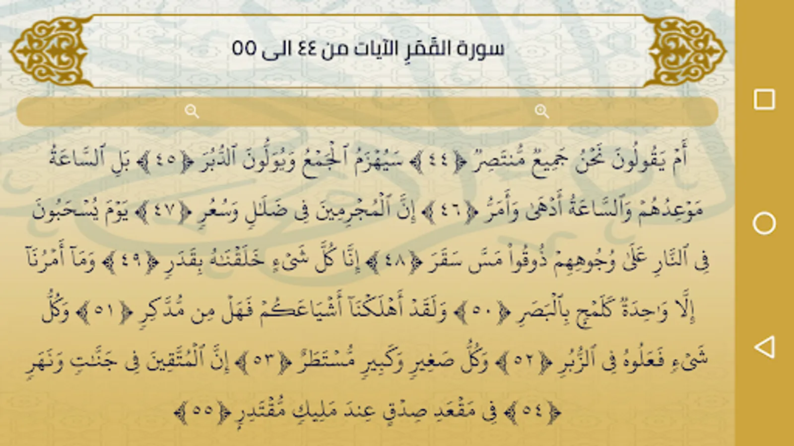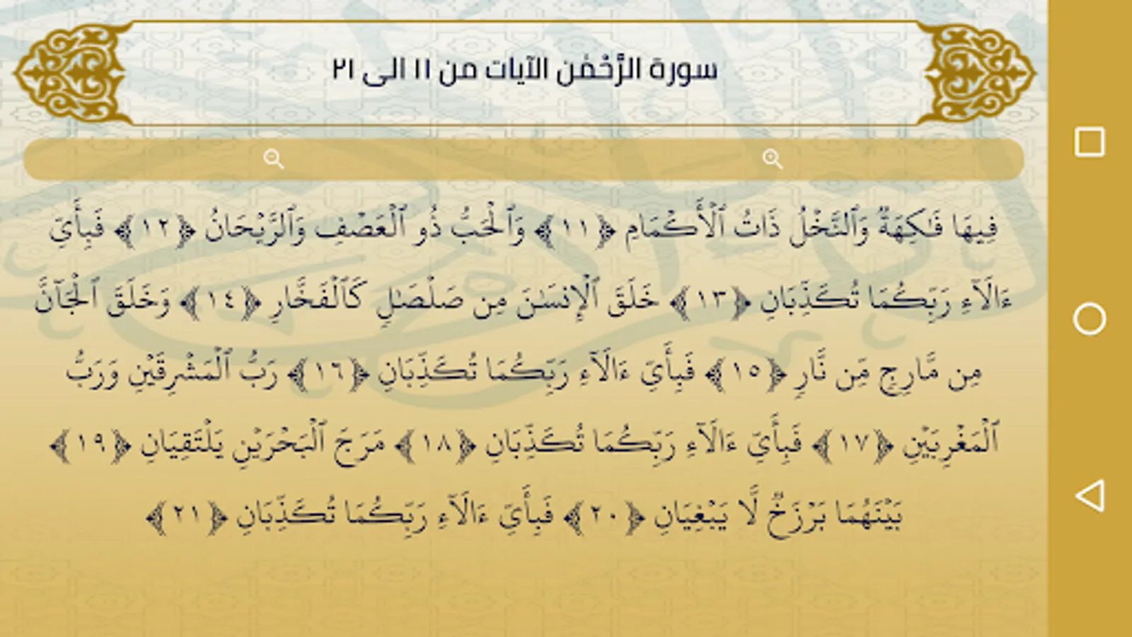 The application does not need the Internet and does not depend on any printed images of the pages of the Qur’an, which makes its size smaller and safer and gives us the possibility to enlarge or reduce the font as mentioned previously.